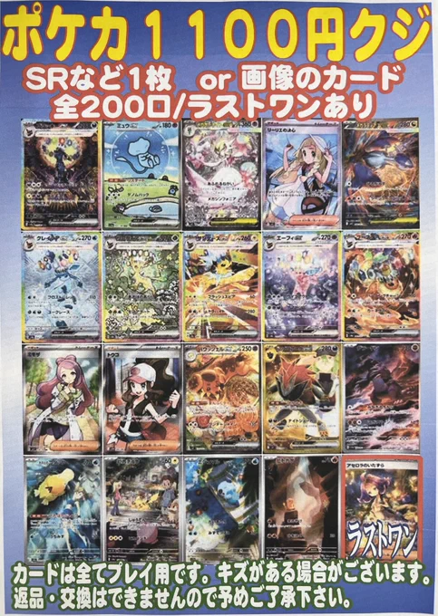 🌈ポケカ1,100円くじ🌈 全200口で展開致しました‼️ ブラッキーexSARやミュウex、メガサーナイトexなどなど豪華ラインナップです✨️ 是非ぜひお試しください(*´ω`*)