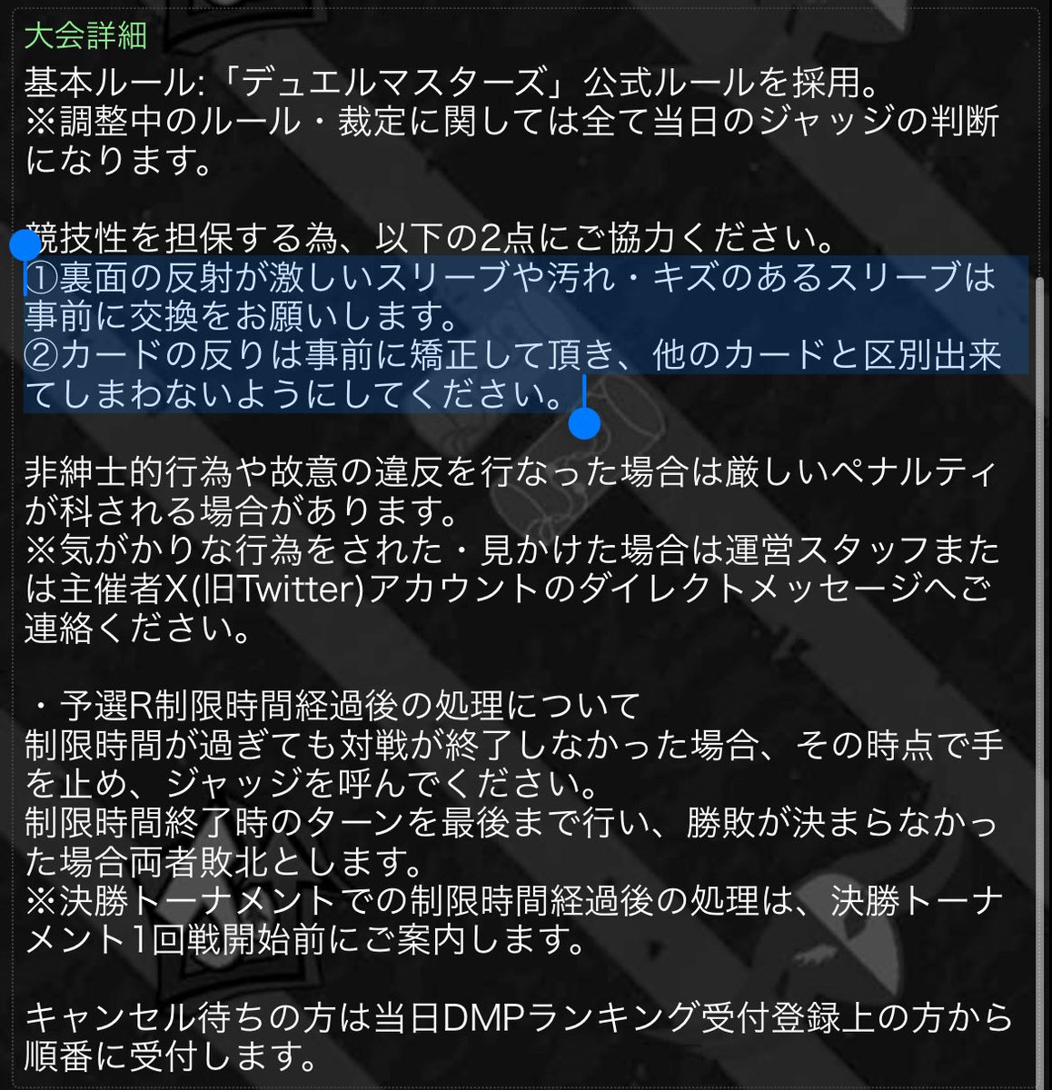おはようございます! デュエルマスターズ郡山miniCS運営からのお知らせです。 競技性担保の為、スリーブの状態やカードの反り矯正をお願いしております。 CS初参加の方も、普段から競技イベントにご参加されている方もいま一度ご確認をお願い致します!☺️