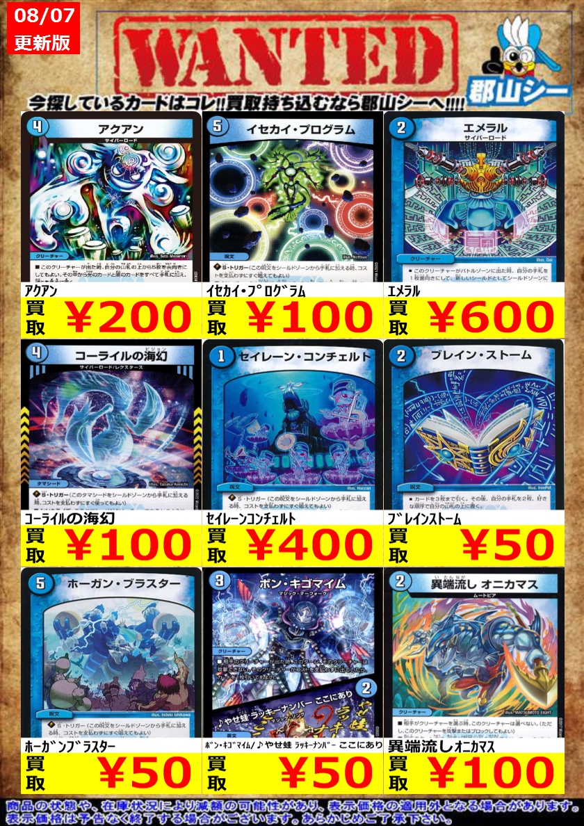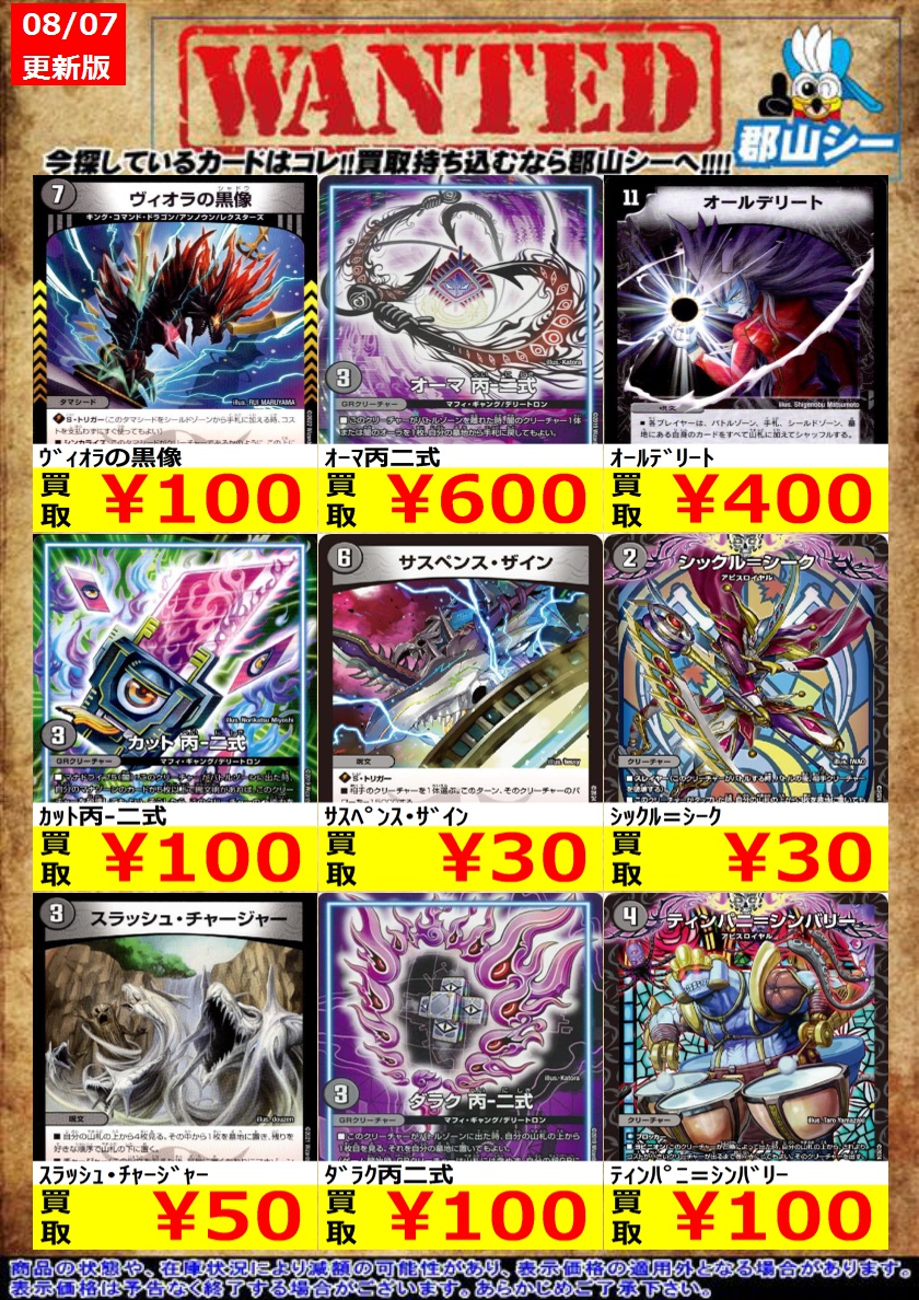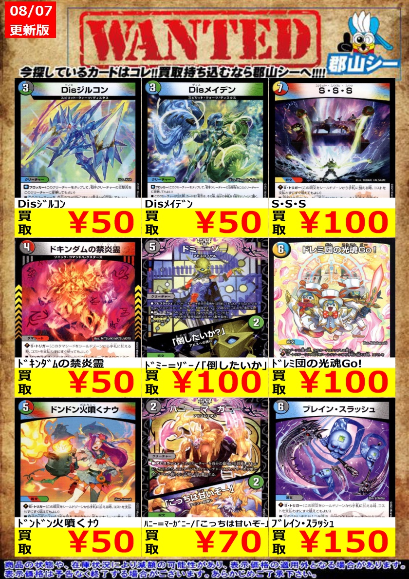 シーガル郡山店デュエマノーマルお買取り情報!! ※商品の状態や在庫状況により減額の可能性があり、表示価格の適用外となる場合がございます。 魔王と天使のカナシミ ¥200 伊達人形ナスロスチャ ¥30 学校男/ゾンビ・カーニバル ¥30
