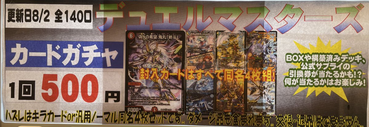 デュエマ500円自販機を補充いたしました❗️ 今回の大当たりは鬼丸「終斗」4枚セットです✨ よろしくお願いいたします🙇♂️