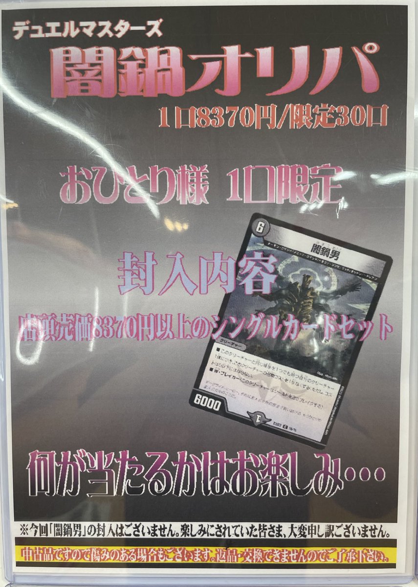 こんにちは😊 シーガル郡山店です。 デュエマ 闇鍋オリパ 残り10口となっております。 ご来店お待ちしております(*^^*)