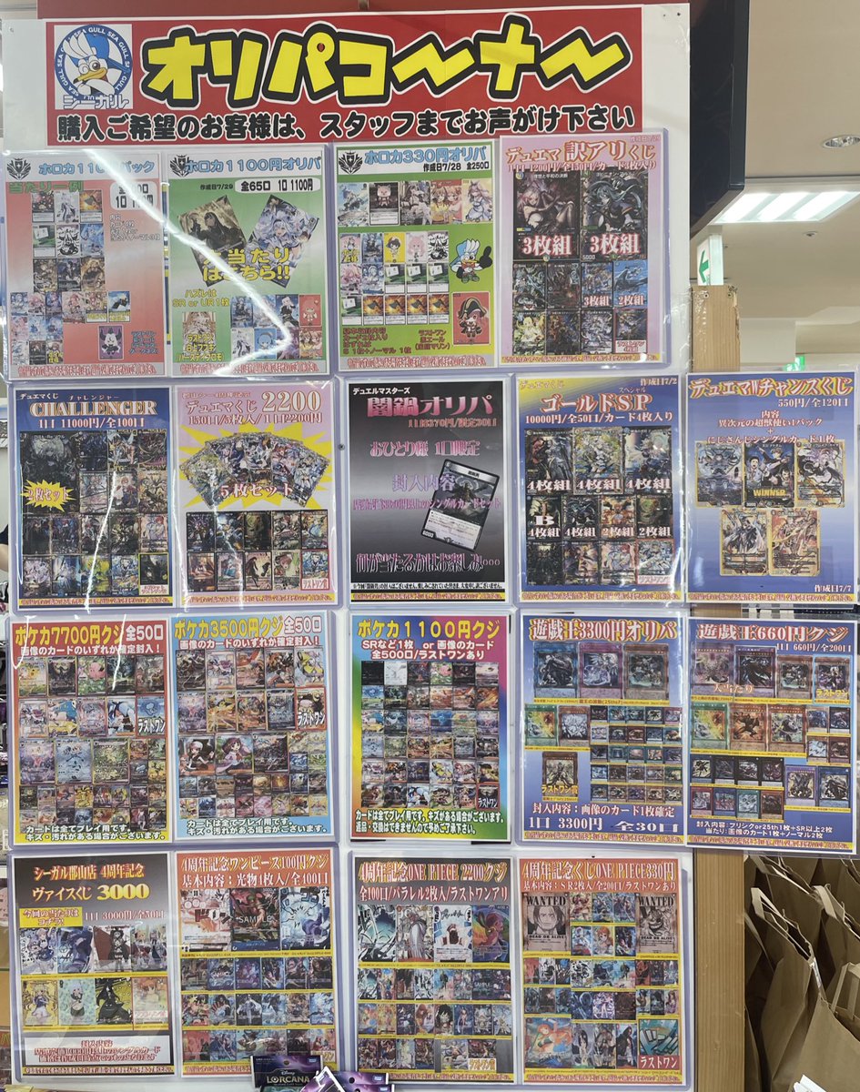 こんにちは😊 シーガル郡山店です。 ただいま展開中のオリパ各種はこちら⬇️⬇️ となっております。 ご来店お待ちしております(*^^*)