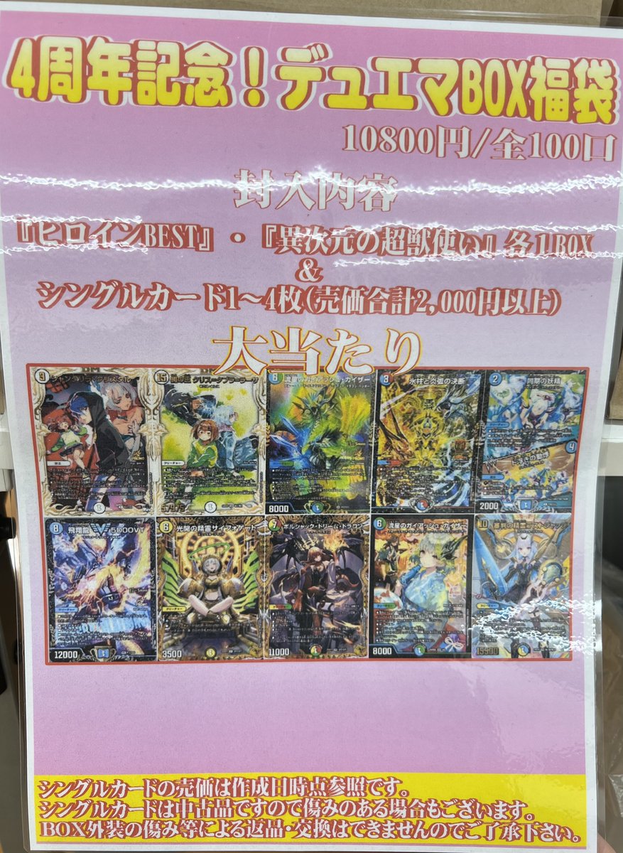 🌈4周年記念デュエマBOX福袋🌈 当初の10%引き(¥10,800)にて販売中です‼️ 大当たりは『シャングリラクリスタル プロモ』✨️ 是非ぜひお試しください(*´ω`*)