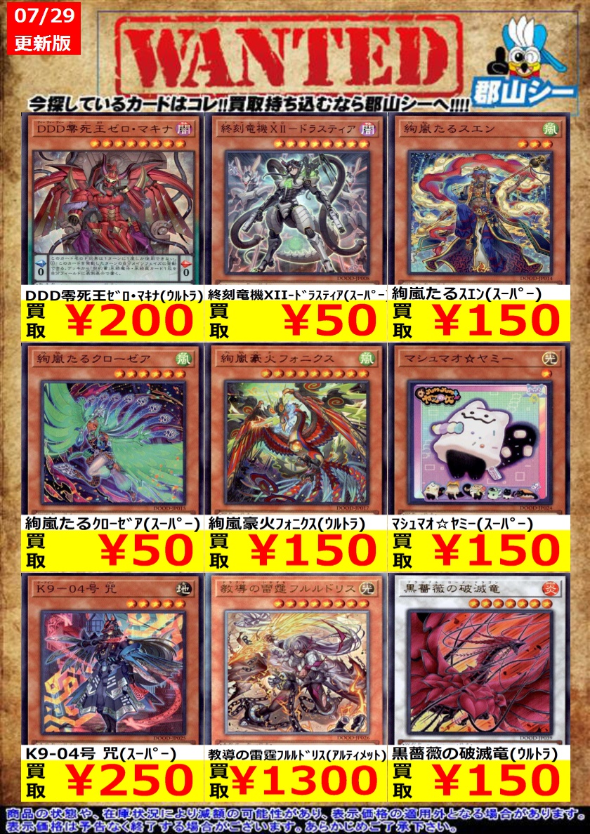 シーガル郡山店遊戯王お買取り情報 ※商品の状態や在庫状況により減額の可能性があり、表示価格の適用外となる場合がございます。 終刻竜機XII-ドラスティア(スーパー) ¥50 絢嵐たるクローゼア(スーパー) ¥50 終刻獄徒 ディアクトロス(スーパー) ¥50 #遊戯王 #シーガル #郡山店