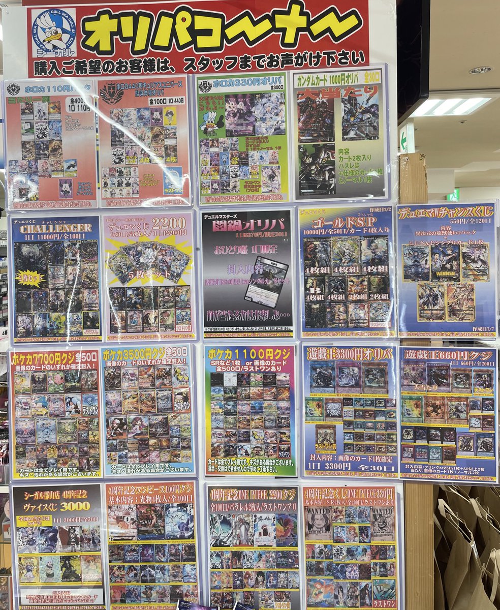 こんにちは(」・ω・) シーガル郡山店です。 4周年記念セール たくさんのご来店誠にありがとうございました。 m(_ _)m 特設会場の方は撤去致しましたが、オリパの方はまだまだ展開中となっております。 ご来店お待ちしております(*^^*)