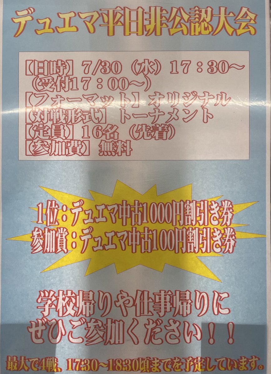 7月30日にデュエマ平日非公認大会を行います❗️ 参加費無料、優勝賞品はデュエマ中古1000円割引券です✨ ご参加お待ちしております🙇♂️