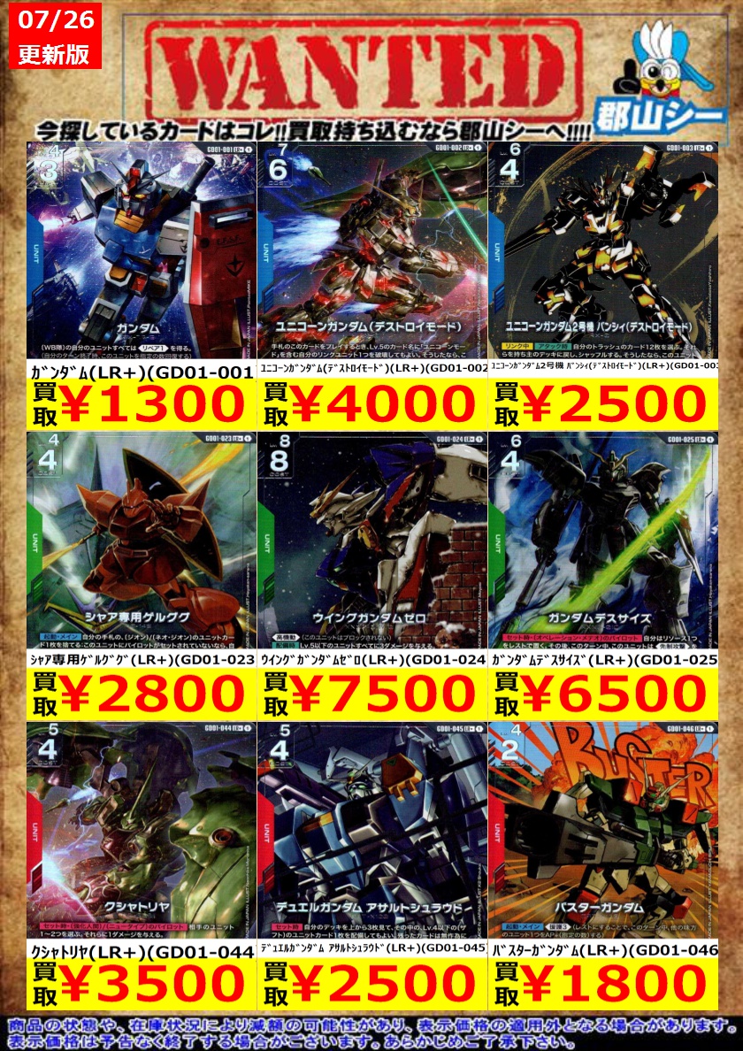 シーガル郡山店ガンダムCGお買取情報!! ガンダム(LR+)(GD01-001) ¥1,300 バスターガンダム(LR+)(GD01-046) ¥1,800 ユニコーンガンダム2号機 バンシィ(デストロイモード)(LR+)(GD01-003) ¥2,500 #ガンダムカードゲーム #GCG #シーガル郡山店