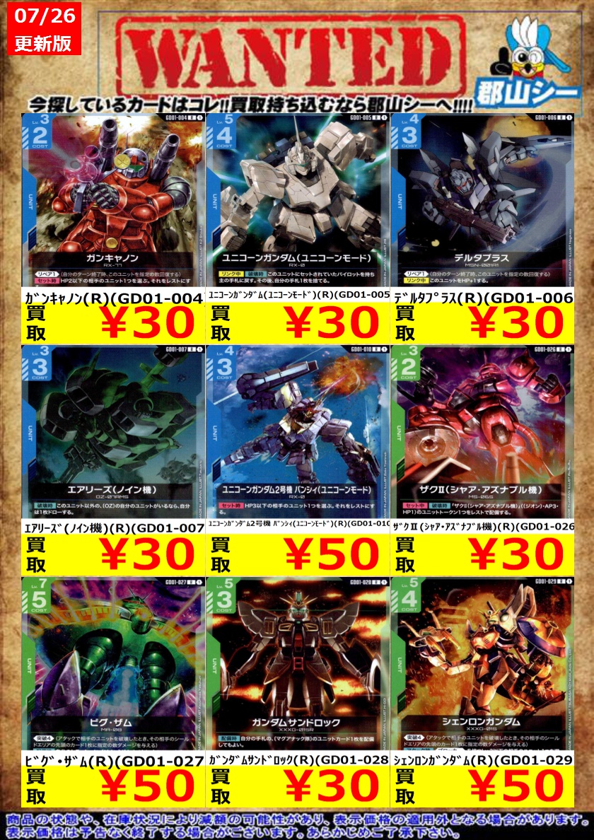 シーガル郡山店ガンダムCGお買取情報!! ユニコーンガンダム2号機 バンシィ(デストロイモード)(LR)(GD01-003) ¥600 シャア専用ゲルググ(LR)(GD01-023) ¥800 ユニコーンガンダム(デストロイモード)(LR)(GD01-002) ¥800 #ガンダムカードゲーム #GCG #シーガル郡山店