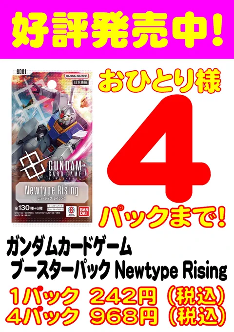 本日発売🎉 #ガンダムカードゲーム ブースターパック 「Newtype Rising」 在庫ございます❗️ ※お一人様4パックまでとなります。 皆様のご来店をお待ちしております😊