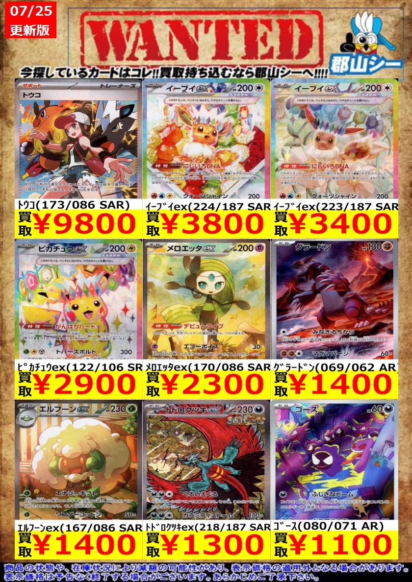 シーガル郡山店ポケカ数量限定お買取り情報更新です!よろしくお願いいたします! ※商品の状態や在庫状況により減額の可能性があり、表示価格の適用外となる場合がございます。 イーブイex(223/187 SAR) ¥3,400 イーブイex(224/187 SAR) ¥3,800 ゴース(080/071 AR) ¥1,100