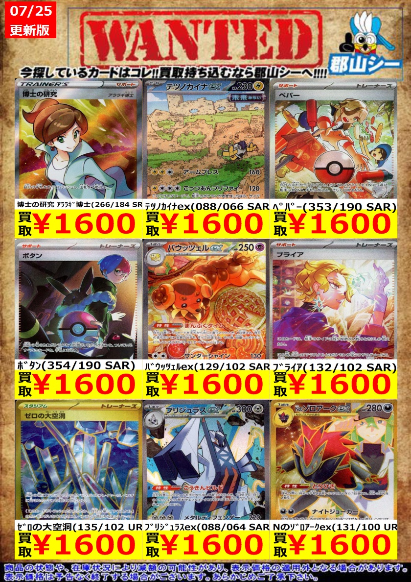 シーガル郡山店ポケカ数量限定お買取り情報更新です!よろしくお願いいたします! ※商品の状態や在庫状況により減額の可能性があり、表示価格の適用外となる場合がございます。 フシギダネ(166/165 AR) ¥700 ゼニガメ(170/165 AR) ¥700 バッフロンex(172/086 SAR) ¥700