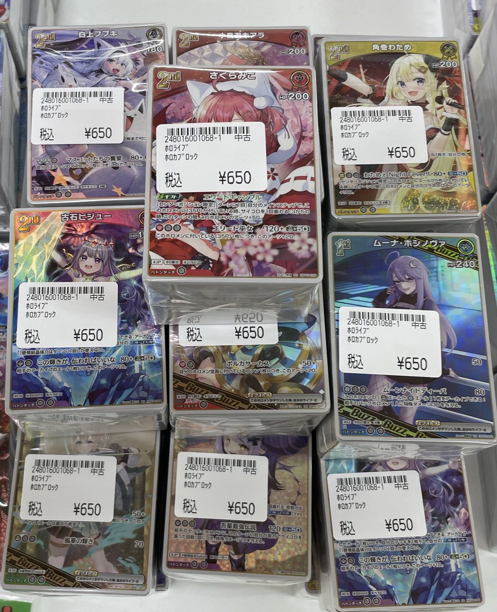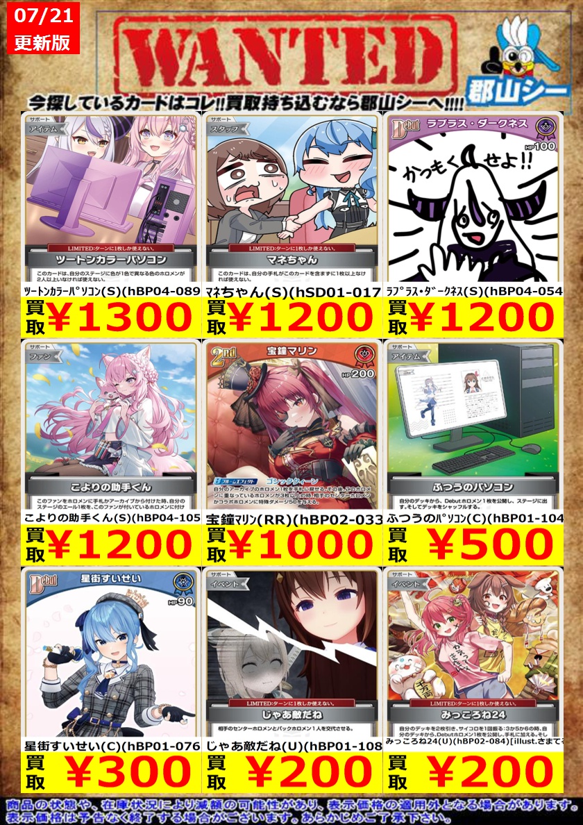 シーガル郡山店ホロライブOCGお買取り情報!! ※商品の状態や在庫状況により減額の可能性があり、表示価格の適用外となる場合がございます。 黄エール(C)(hY06-001) ¥30 春先のどか(C)(hSD01-016) ¥80 宝鐘マリン(R)(hBP02-032) ¥100 #ホロライブOCG #ホロカ #シーガル郡山