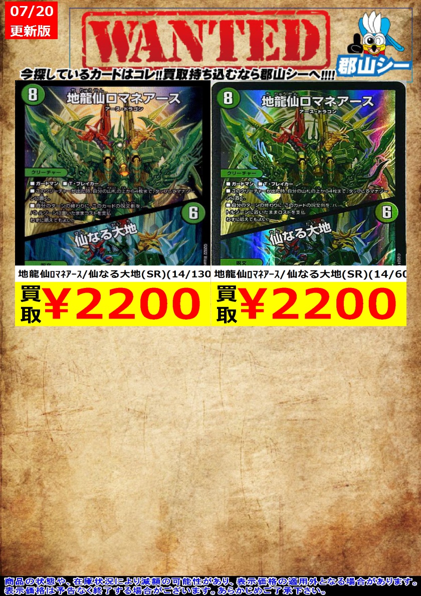 シーガル郡山店デュエマお買取り情報!! ※商品の状態や在庫状況により減額の可能性があり、表示価格の適用外となる場合がございます。 地龍仙ロマネアース/仙なる大地(SR)(14/130) ¥2,200 地龍仙ロマネアース/仙なる大地(SR)(14/60) ¥2,200