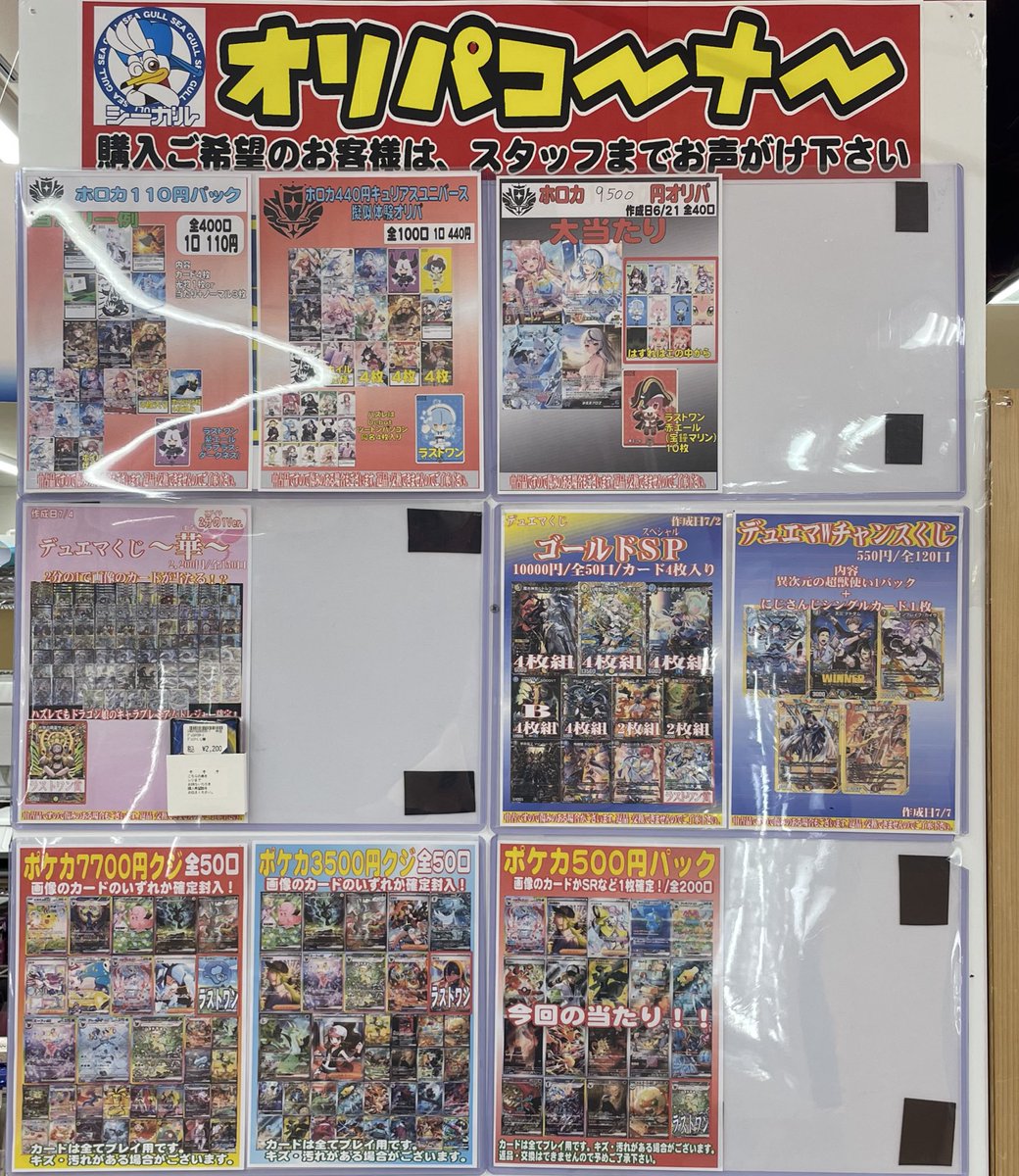 こんにちは‼️ シーガル郡山店です。 ただいま展開中のオリパ各種はこちら⬇️⬇️⬇️ となっております。 ご来店お待ちしております(*^^*)