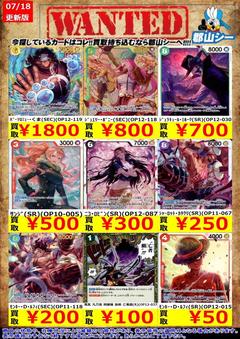 シーガル郡山店ワンピースお買取り情報!※商品の状態や在庫状況により減額の可能性があり、表示価格の適用外になる場合がございます。予めご了承ください。 モンキー・D・ルフィ(SR)(OP12-015) ¥50 シャーロット・カタクリ(SR)(OP11-067) ¥250 #高価買取 #ワンピース #シーガル郡山