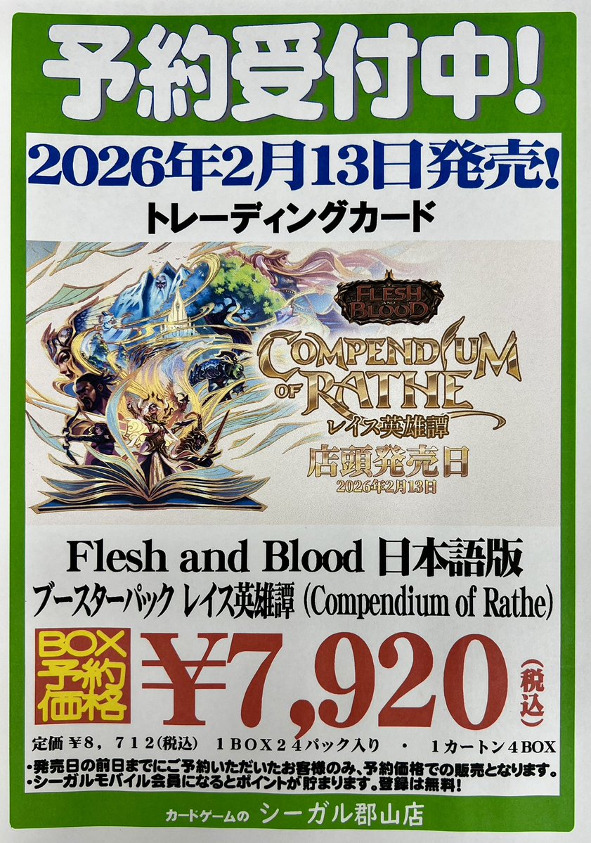 【ご予約受付中】 2/13(金) 発売 フレッシュ&ブラッドTCG日本語版 ブースターパック 「レイス英雄譚(Compendium of Rathe)」 ただいま予約受付中です❗️ ご予約お待ちしております😊 #シーガル郡山店予約