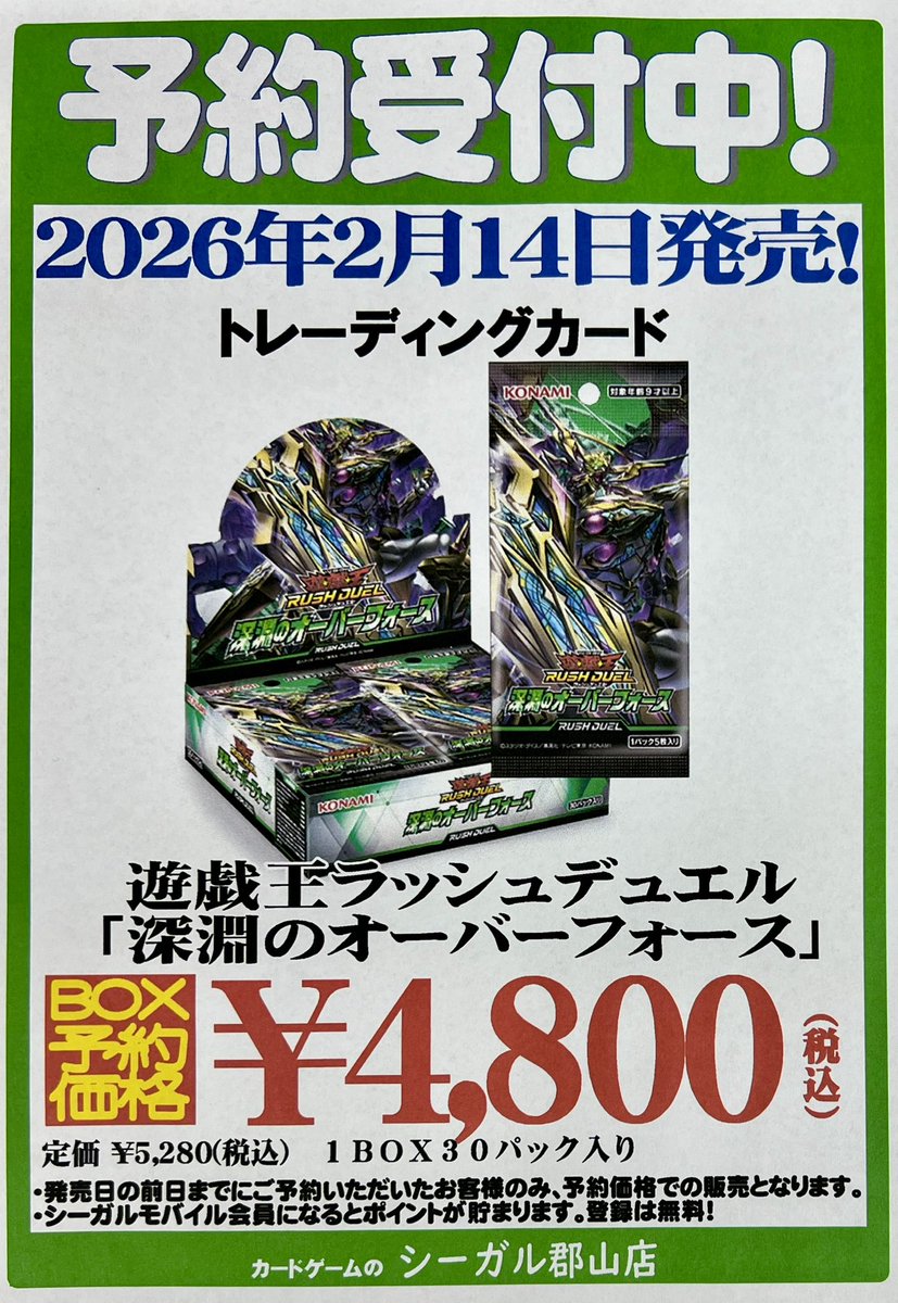 【ご予約受付中】 2/14(土) 発売 #遊戯王ラッシュデュエル 「深淵のオーバーフォース」 ただいま予約受付中です❗️ ご予約お待ちしております😊 #シーガル郡山店予約
