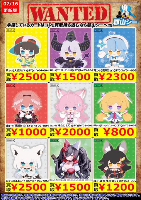 シーガル郡山店ホロライブOCGお買取り情報!! ※商品の状態や在庫状況により減額の可能性があり、表示価格の適用外となる場合がございます。 白エール(博衣こより)(SY)(hY01-006) ¥2,000 緑エール(アキ・ローゼンタール)(SY)(hY02-005) ¥800 赤エール(鷹嶺ルイ)(SY)(hY03-004) ¥1,000