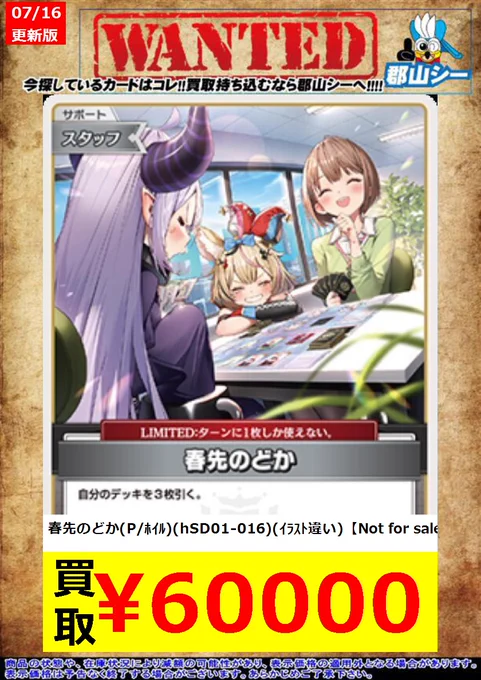 シーガル郡山店ホロライブOCGお買取り情報!! ※商品の状態や在庫状況により減額の可能性があり、表示価格の適用外となる場合がございます。 マネちゃん(C)(hSD01-017)[illust.こまいぬ] ¥20 黄エール(C)(hY06-001) ¥30 春先のどか(C)(hSD01-016) ¥80 #ホロライブOCG #ホロカ #シーガル郡山