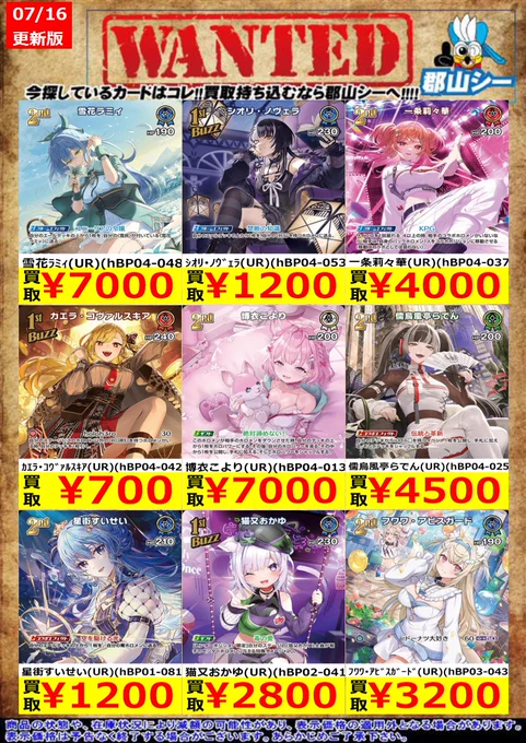 シーガル郡山店ホロライブOCGお買取り情報!! ※商品の状態や在庫状況により減額の可能性があり、表示価格の適用外となる場合がございます。 小鳥遊キアラ(UR)(hBP01-067) ¥300 兎田ぺこら(UR)(hBP01-043) ¥300 ベスティア・ゼータ(UR)(hBP01-027) ¥300 #ホロライブOCG #ホロカ #シーガル郡山