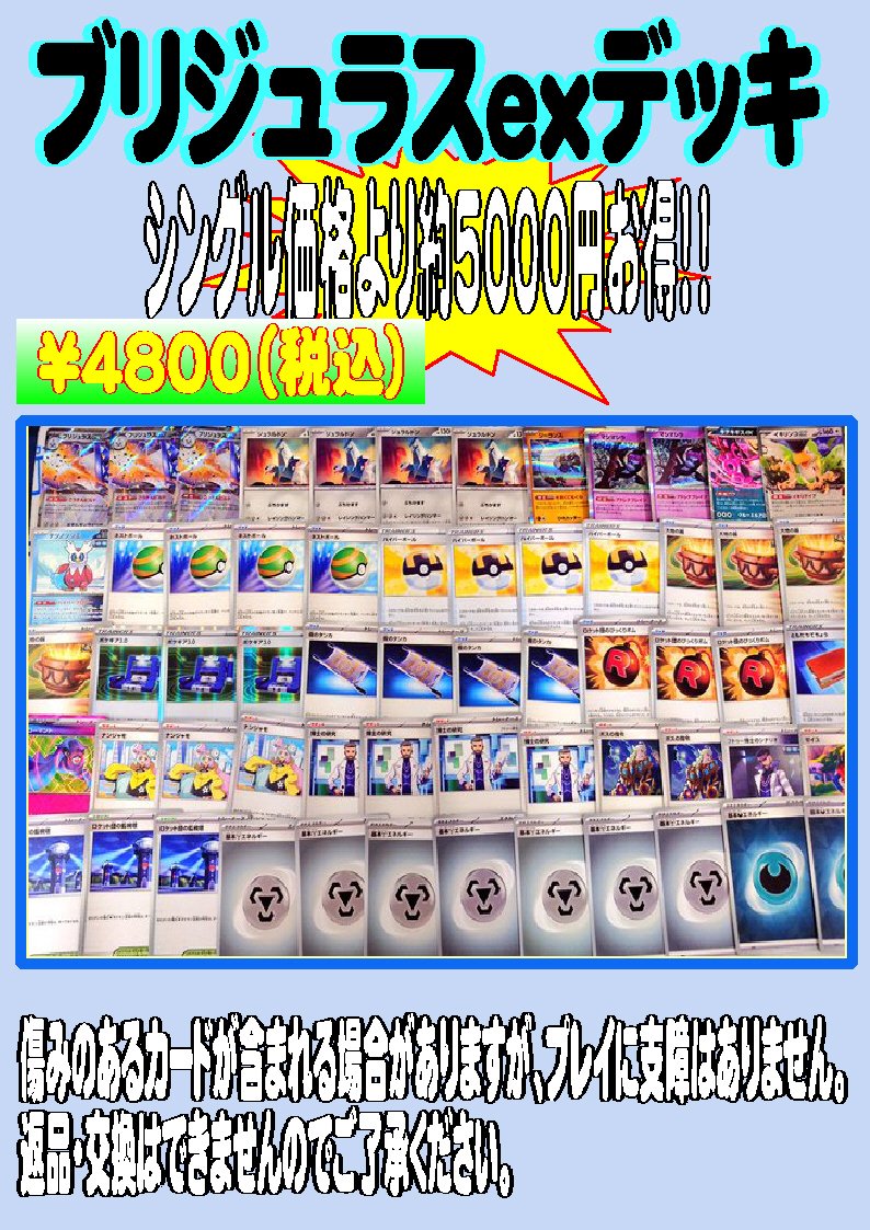 シーガル郡山店です! ショーケースにて すぐに対戦できる 構築済みデッキ 販売中! #シーガル郡山店デッキ販売 にて リストの確認もOK! 店頭ファイルでも確認いただけます! ブリジュラスex デッキ 作成しました! イベントも各種開催中!ご参加お待ちしております😊