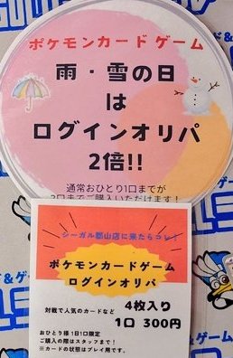 シーガル郡山店です! ポケモンカード レジにて販売中 ログインオリパ 通常1口までのところ本日は雨の日2倍デー 2口までご購入いただけます! お求めの際はレジスタッフまで✨ ご来店お待ちしております😊