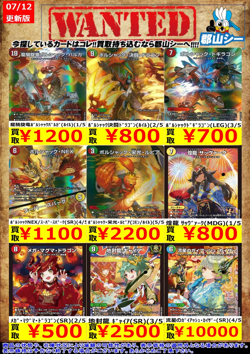 シーガル郡山店デュエマお買取り情報!! ※商品の状態や在庫状況により減額の可能性があり、表示価格の適用外となる場合がございます。 神楯と天門と正義の決断(SR)(6/6) ¥400 生命と大地と轟破の決断(SR)(2/6) ¥500 ボルシャック決闘ドラゴン(ホイル)(2/5) ¥800