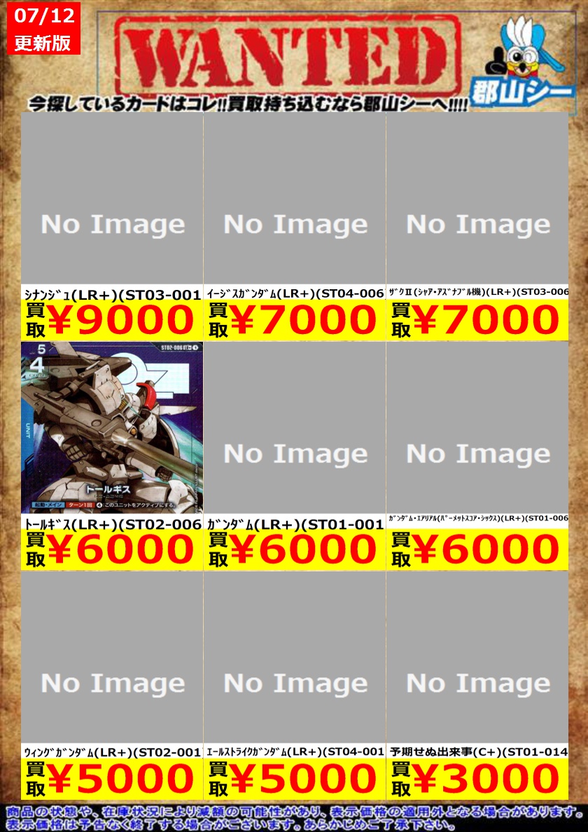 シーガル郡山店ガンダムCGお買取情報!! ウィングガンダム(LR)(ST02-001) ¥50 エールストライクガンダム(LR)(ST04-001) ¥50 トールギス(LR)(ST02-006) ¥100