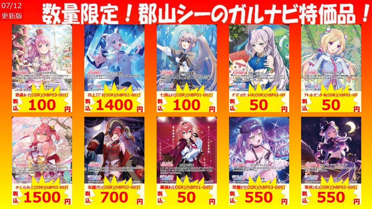 数量限定郡山シー限定ガルナビ特価品! 一条莉々華(RR)(hBP04-037) ¥150 雪花ラミィ(RR)(hBP04-048) ¥150 大空スバル(RR)(hBP04-072) ¥150 #ホロカ #特価品 #シーガル郡山