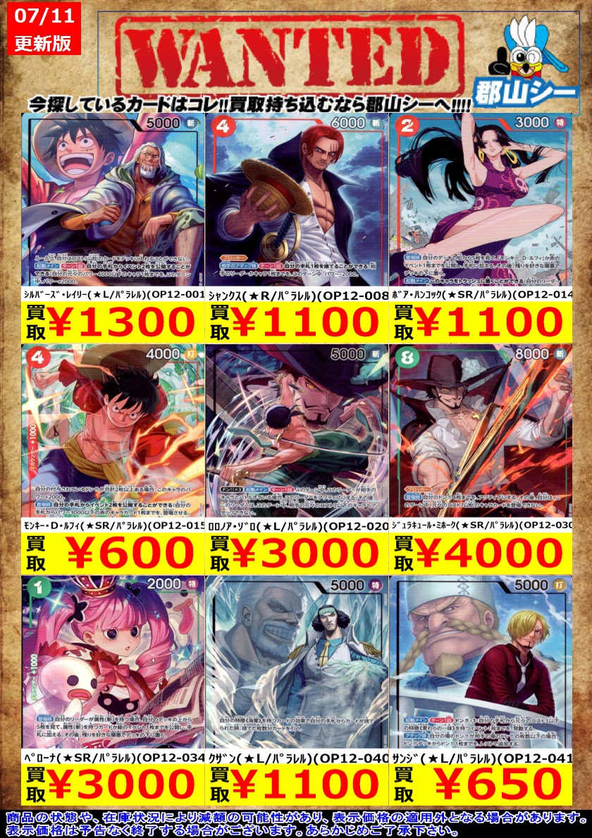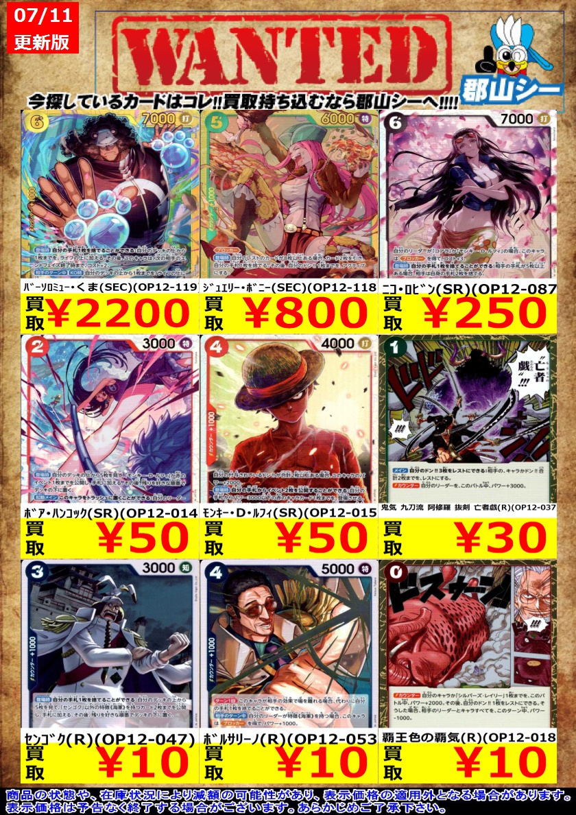シーガル郡山店ワンピースお買取り情報!※商品の状態や在庫状況により減額の可能性があり、表示価格の適用外になる場合がございます。予めご了承ください。 鬼気 九刀流 阿修羅 抜剣 亡者戯(R)(OP12-037) ¥30 ニコ・ロビン(SR)(OP12-087) ¥250 #高価買取 #ワンピース #シーガル郡山