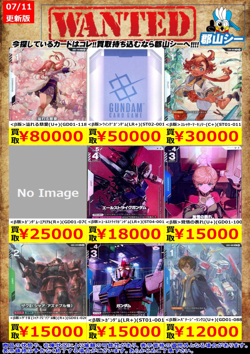 シーガル郡山店ガンダムCGお買取情報!! <β版>ザクⅡ(シャア・アズナブル機)(R)(GD01-026) ¥10 <β版>迎撃命令(R)(GD01-099) ¥10 <β版>立てよ国民!(R)(GD01-105) ¥10