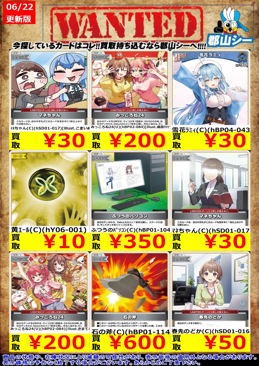 シーガル郡山店ホロライブOCGお買取り情報!! ※商品の状態や在庫状況により減額の可能性があり、表示価格の適用外となる場合がございます。 風真いろは(腕伸ばし)(U)(hBP01-050) ¥10 マネちゃん(C)(hSD01-017) ¥30 春先のどか(C)(hSD01-016) ¥50