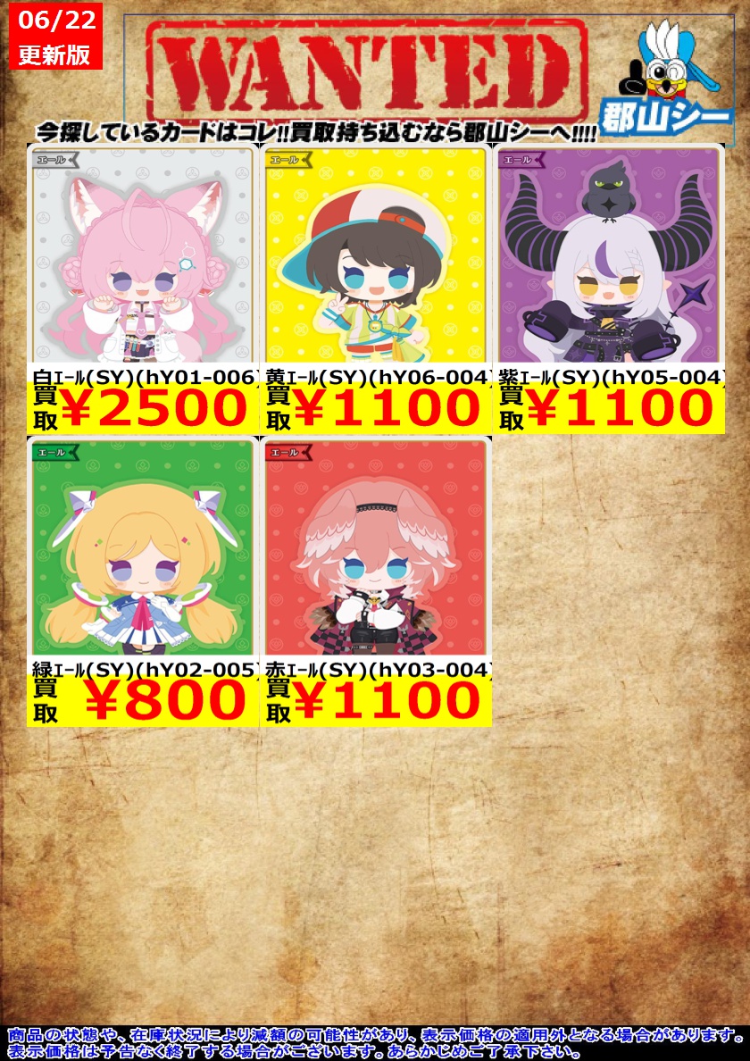 シーガル郡山店ホロライブOCGお買取り情報!! ※商品の状態や在庫状況により減額の可能性があり、表示価格の適用外となる場合がございます。 緑エール(SY)(hY02-005) ¥800 紫エール(SY)(hY05-004) ¥1,100 赤エール(SY)(hY03-004) ¥1,100