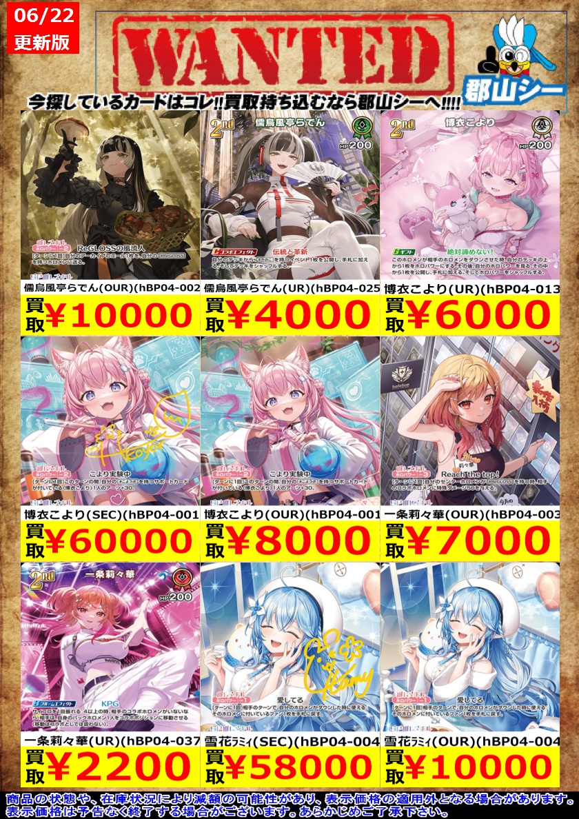 シーガル郡山店ホロライブOCGお買取り情報!! ※商品の状態や在庫状況により減額の可能性があり、表示価格の適用外となる場合がございます。 儒烏風亭らでん(SR)(hBP04-024) ¥250 ラオーラ・パンテーラ(SR)(hBP04-019) ¥250 儒烏風亭らでん(SR)(hBP04-025) ¥250
