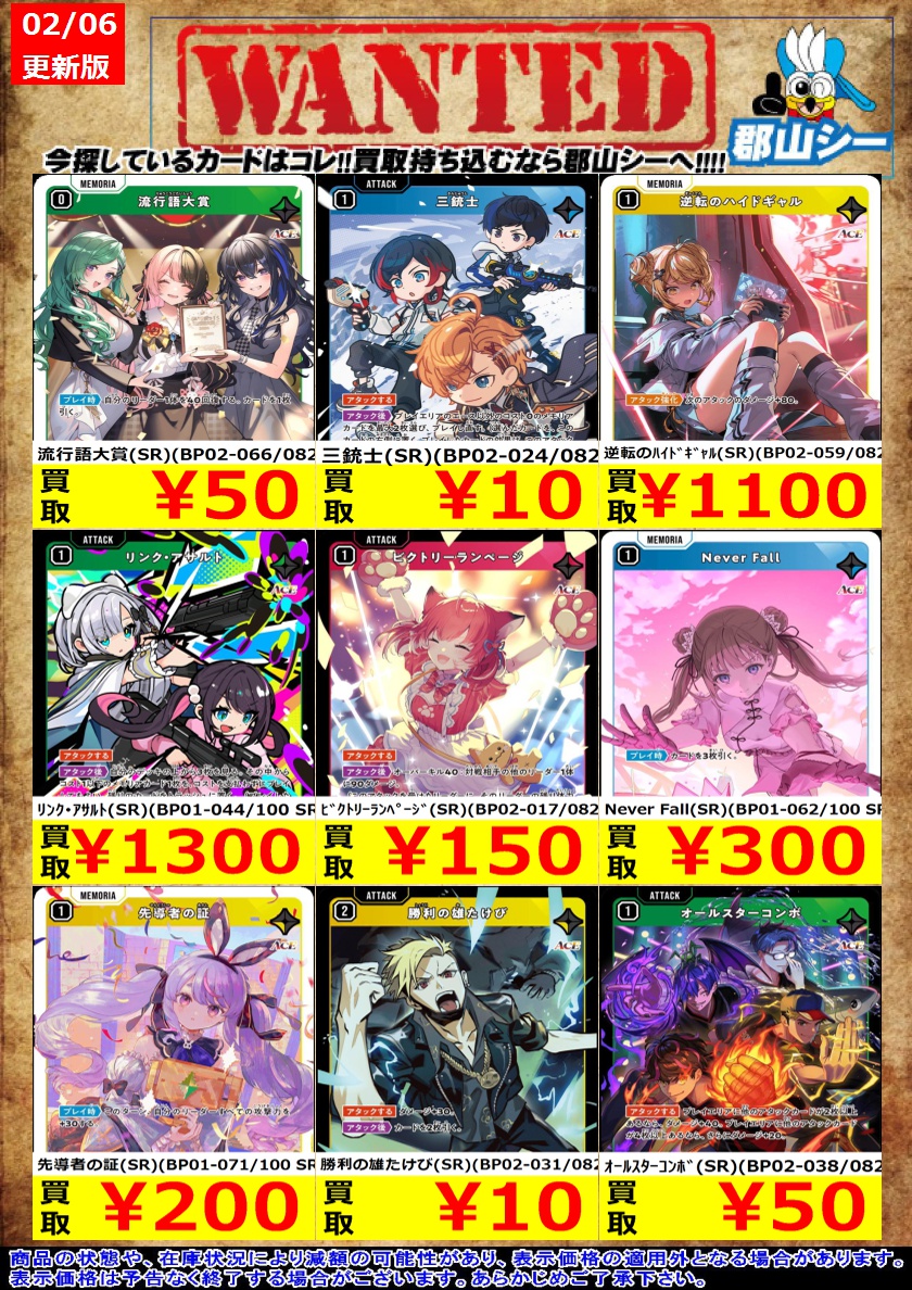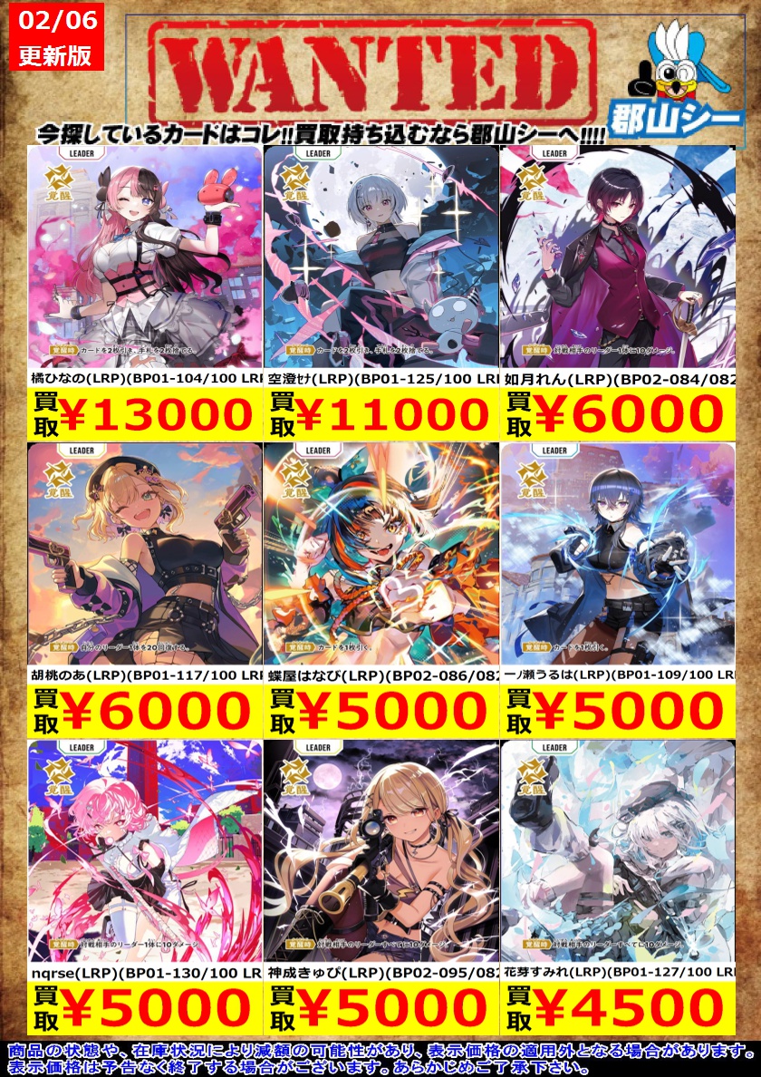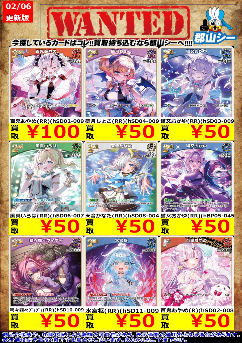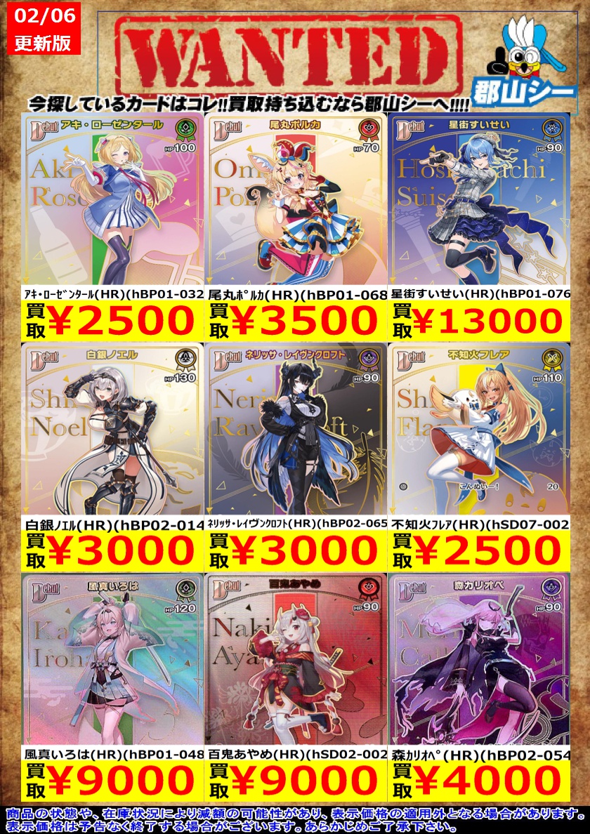シーガル郡山店ホロライブOCGお買取り情報!! ※商品の状態や在庫状況により減額の可能性があり、表示価格の適用外となる場合がございます。 白銀ノエル(UR)(hBP05-012) ¥3,000 パヴォリア・レイネ(UR)(hBP02-023) ¥3,500 猫又おかゆ(UR)(hBP02-041) ¥4,500