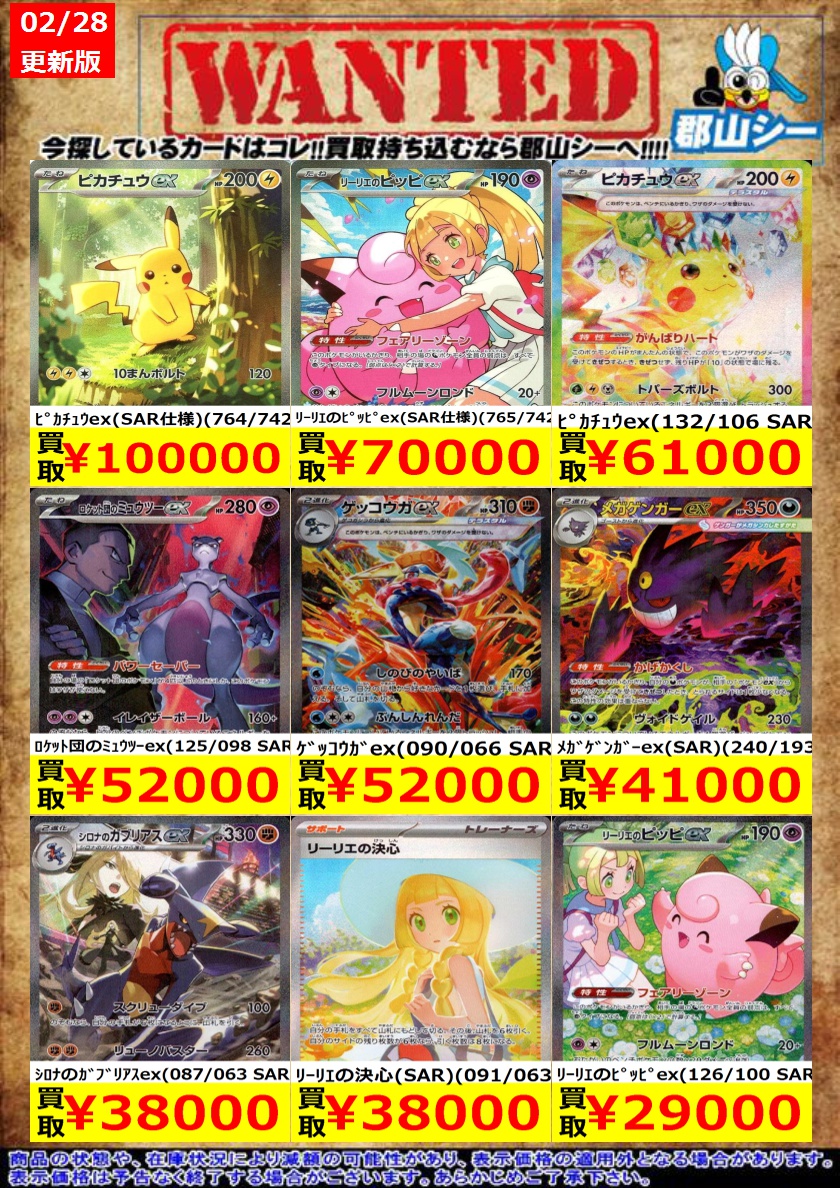 シーガル郡山店ポケカ数量限定お買取り情報更新です!よろしくお願いいたします! ※商品の状態や在庫状況により減額の可能性があり、表示価格の適用外となる場合がございます。 イーブイex(223/187 SAR) ¥5,200 ニンフィアex(212/187 SAR) ¥14,000 メガサーナイトex(SAR)(087/063) ¥14,000