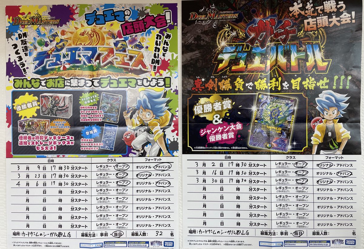 こんにちは、シーガル郡山店です😊 次回以降のデュエマ公認大会のスケジュールはこちらです❗️ 開催が毎週土曜日から毎週月曜日に変更となりますのでご注意ください🙇♂️