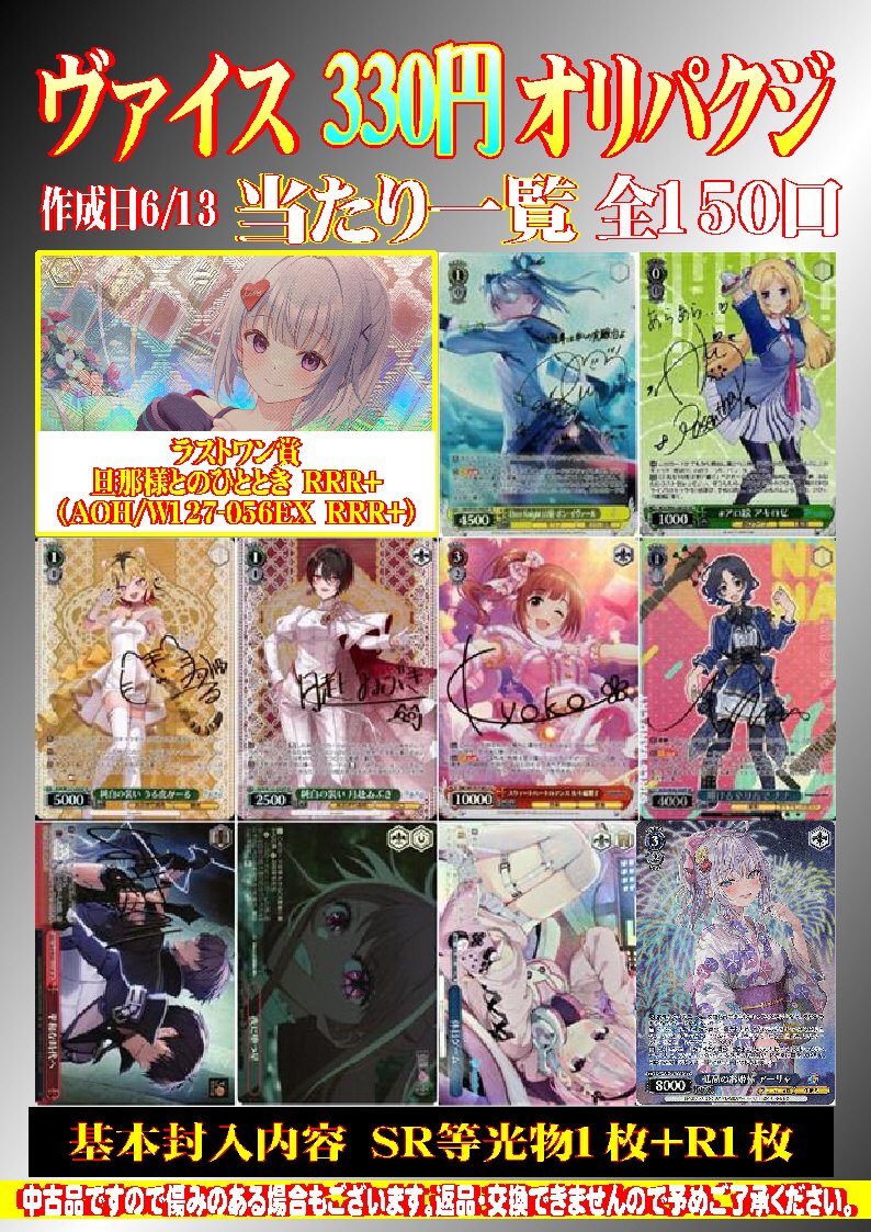 シーガル郡山店です! ヴァイス330円オリパクジ 作成しました✨ 全150口、ラストワン賞ご用意しております! よろしくお願いします‼️‼️