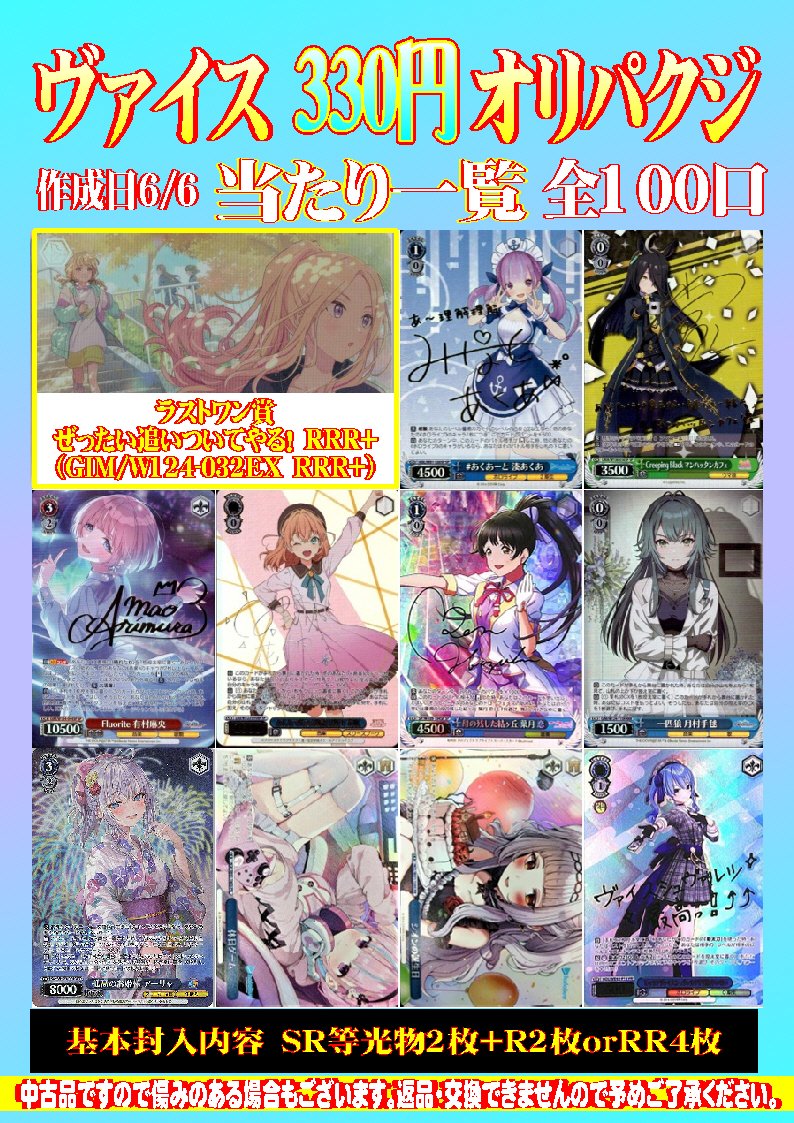 シーガル郡山店です! ヴァイスシュヴァルツ 330円オリパクジ 作成しました✨ 全100口、ラストワン賞有となっております! よろしくお願いします‼️‼️