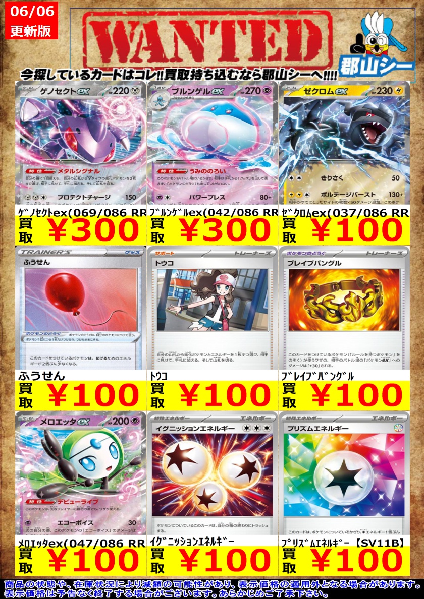 シーガル郡山店ポケカ数量限定お買取り情報更新です!よろしくお願いいたします! ※商品の状態や在庫状況により減額の可能性があり、表示価格の適用外となる場合がございます。 ふうせん ¥100 ツールスクラッパー ¥30 プロトーガ(たいこのもくず/なみのり) ¥10
