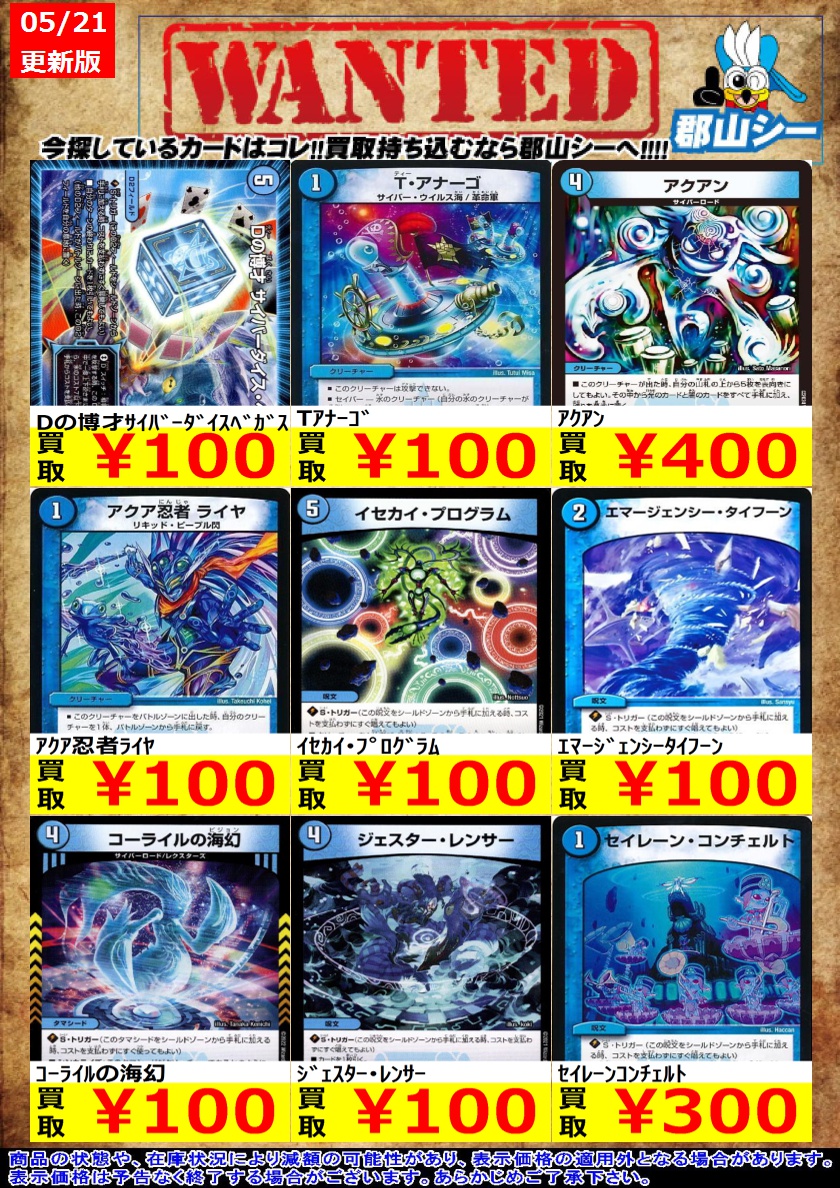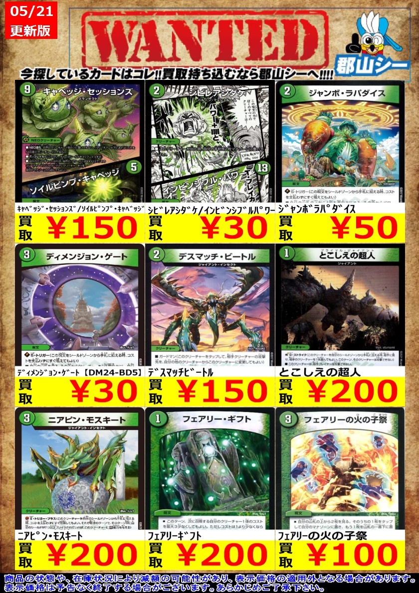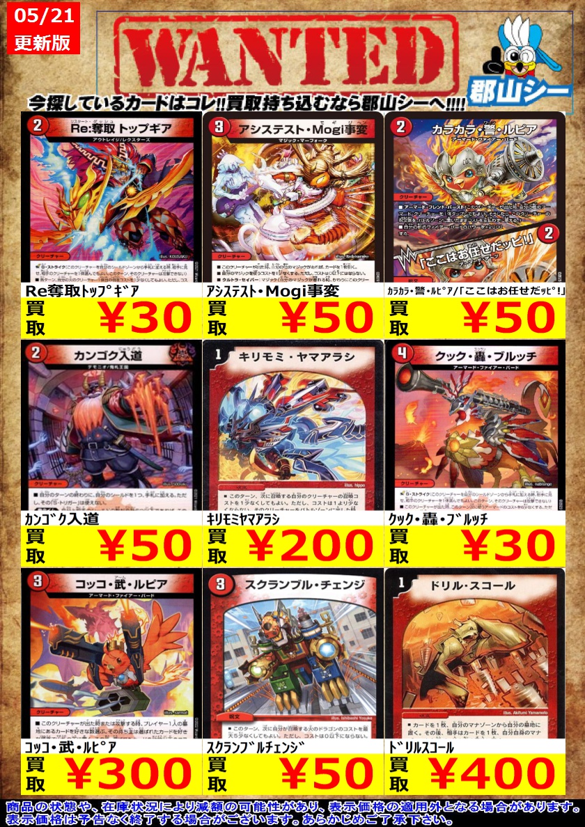 シーガル郡山店デュエマノーマルお買取り情報!! ※商品の状態や在庫状況により減額の可能性があり、表示価格の適用外となる場合がございます。 ボイルチャージャー ¥50 パッピ・ラッピー ¥50 カンゴク入道 ¥50