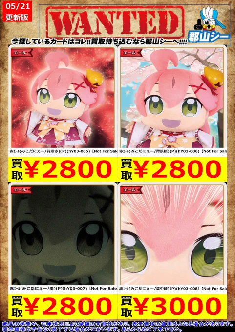 シーガル郡山店ホロライブOCGお買取り情報!! ※商品の状態や在庫状況により減額の可能性があり、表示価格の適用外となる場合がございます。 小鳥遊キアラ(OUR)(hBP01-006) ¥4,000 角巻わため(OUR)(hBP03-007) ¥7,500 七詩ムメイ(OUR)(hBP01-002) ¥10,000