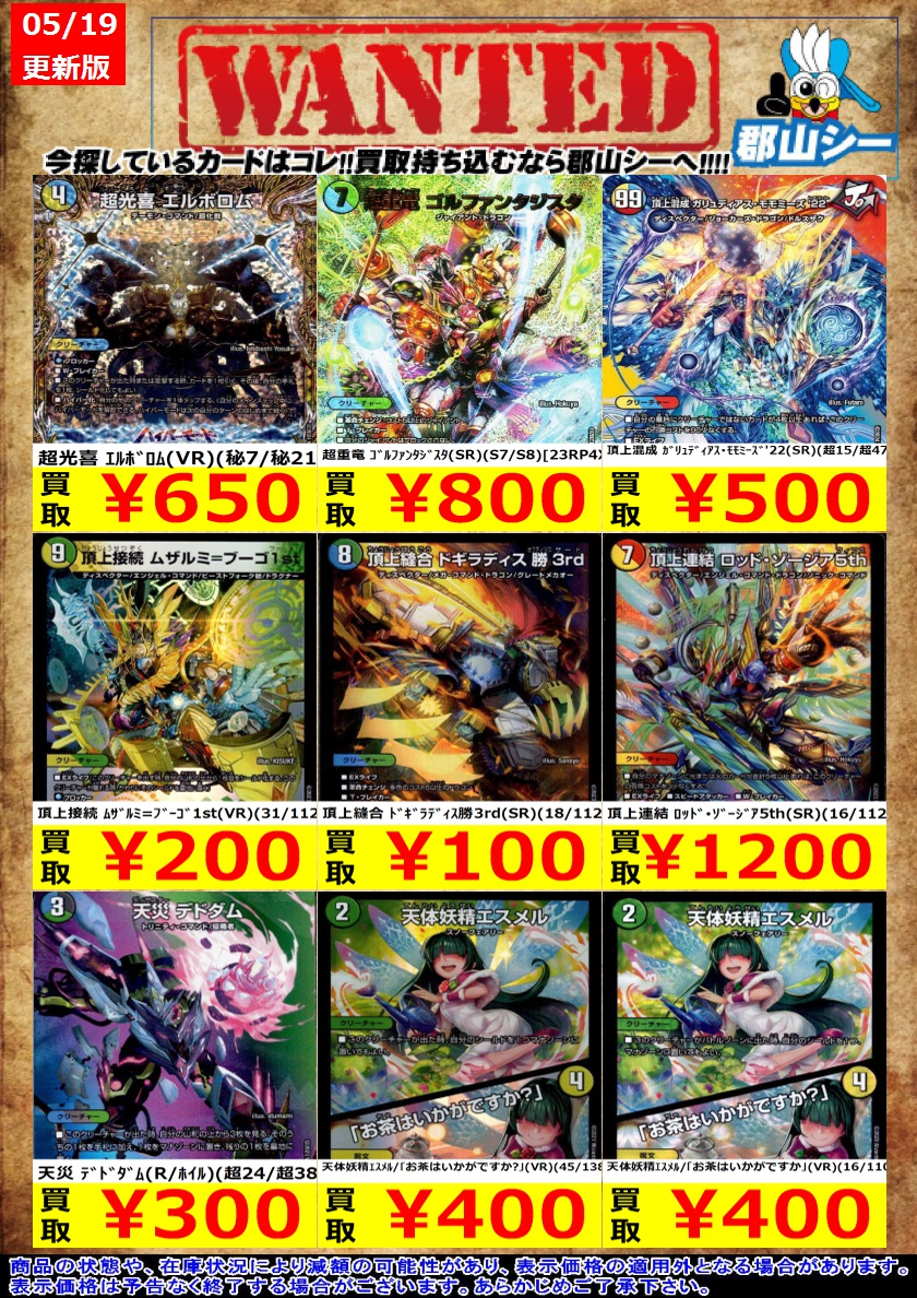 シーガル郡山店デュエマお買取り情報!! ※商品の状態や在庫状況により減額の可能性があり、表示価格の適用外となる場合がございます。 刀舞の3号 カツえもん(ホイル)(15/21) ¥50 頂上接続 ムザルミ=ブーゴ1st(VR)(31/112) ¥200 天災 デドダム(R/ホイル)(超24/超38) ¥300