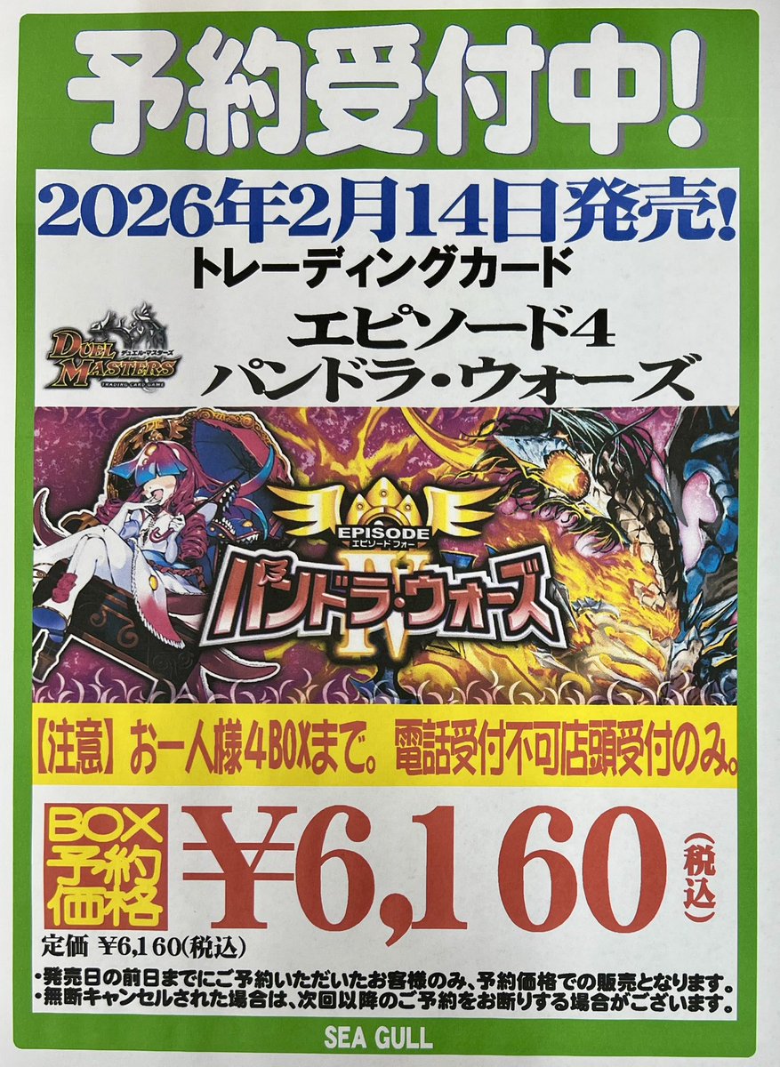 【ご予約受付中】 2/14(土) 発売 #デュエル・マスターズTCG エピソード4 「パンドラ・ウォーズ」 本日よりご予約受付開始しました❗️ ※おひとり様4BOXまでとなります ご予約お待ちしております😊 #シーガル郡山店予約