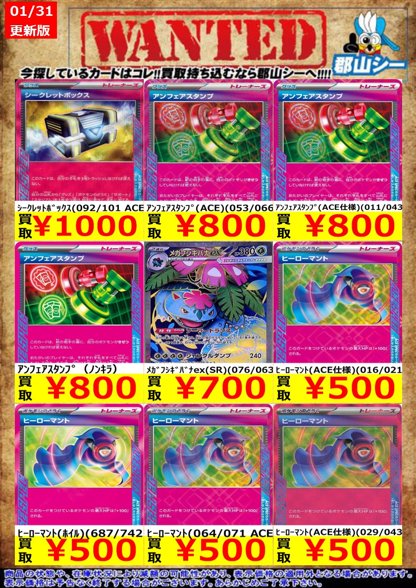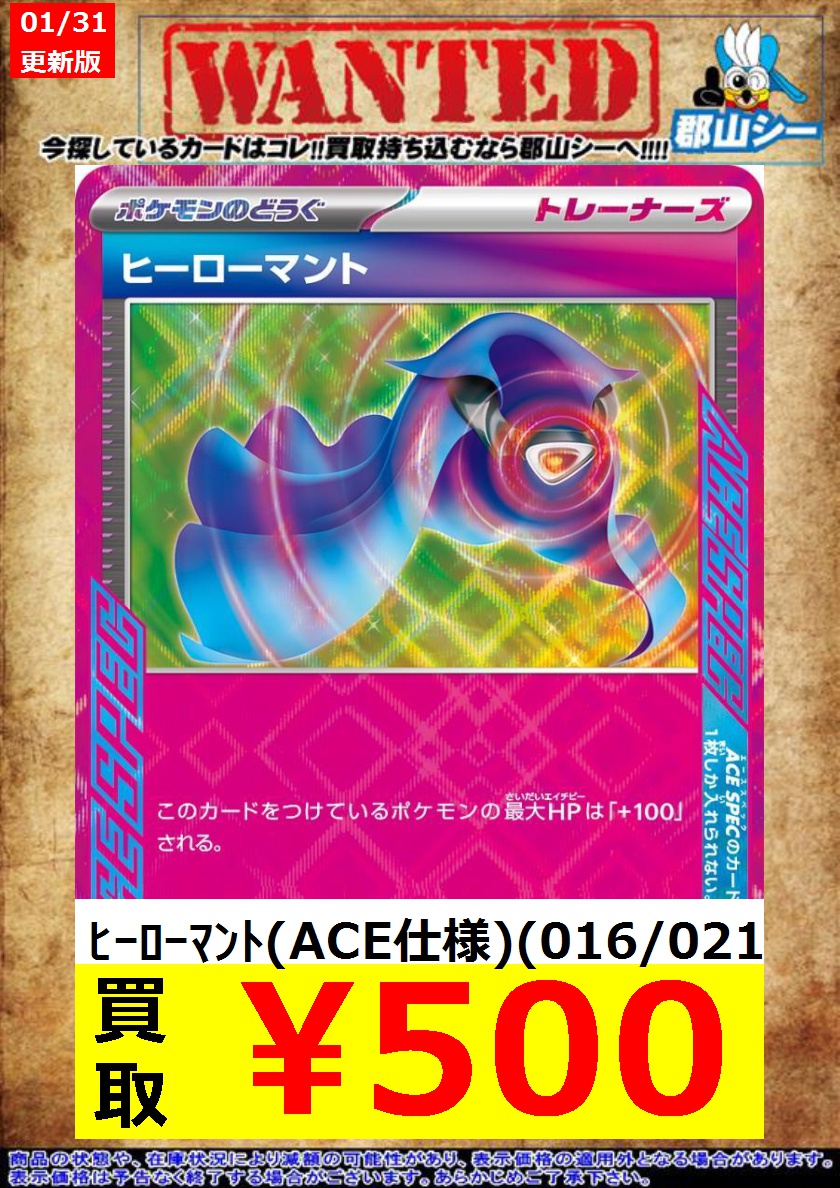 シーガル郡山店ポケカ数量限定お買取り情報更新です!よろしくお願いいたします! ※商品の状態や在庫状況により減額の可能性があり、表示価格の適用外となる場合がございます。 ヒーローマント(064/071 ACE) ¥500 ヒーローマント(ACE仕様)(016/021) ¥500 ヒーローマント(ACE仕様)(029/043) ¥500