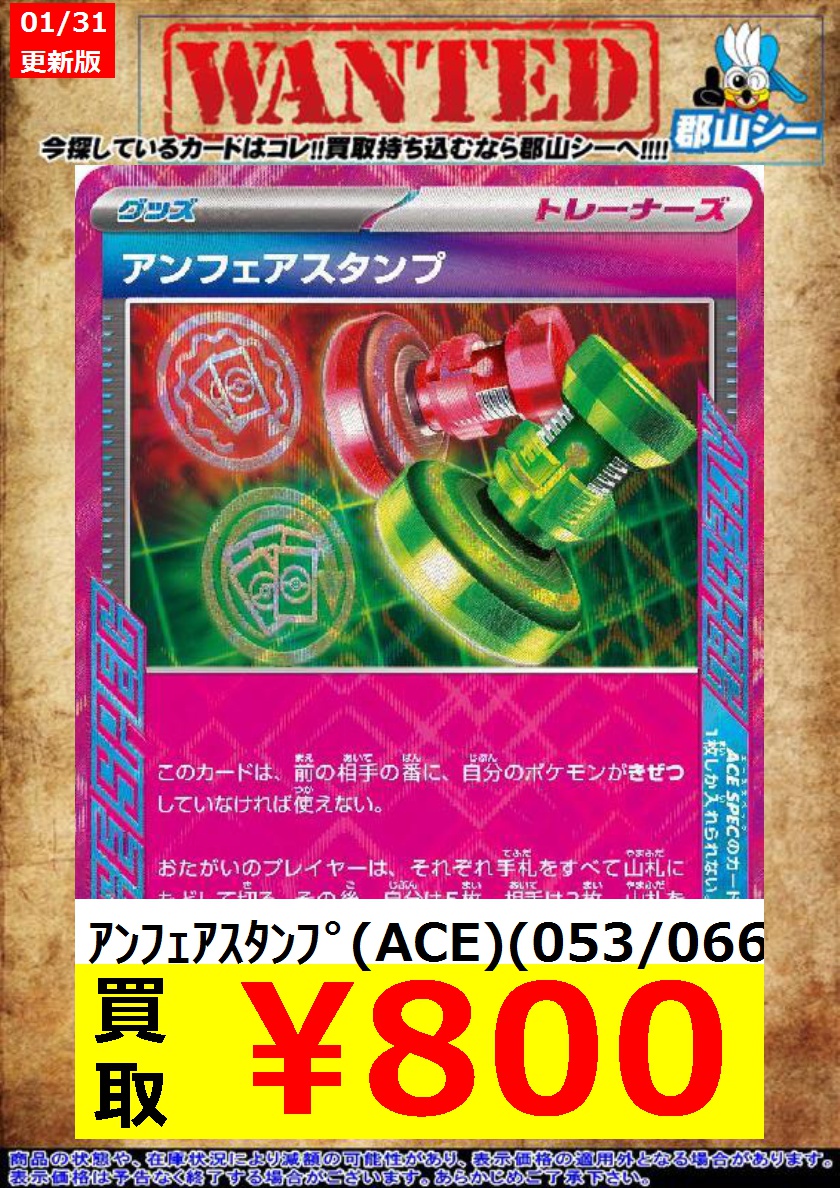 シーガル郡山店ポケカ数量限定お買取り情報更新です!よろしくお願いいたします! ※商品の状態や在庫状況により減額の可能性があり、表示価格の適用外となる場合がございます。 アンフェアスタンプ(ACE)(053/066) ¥800 アンフェアスタンプ(ノンキラ) ¥800