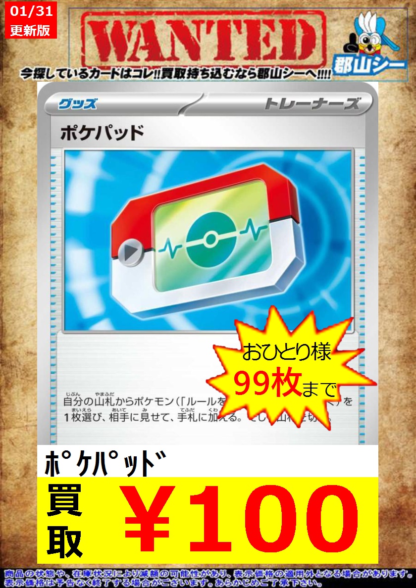 シーガル郡山店ポケカ数量限定お買取り情報更新です!よろしくお願いいたします! ※商品の状態や在庫状況により減額の可能性があり、表示価格の適用外となる場合がございます。 ポケパッド ¥100