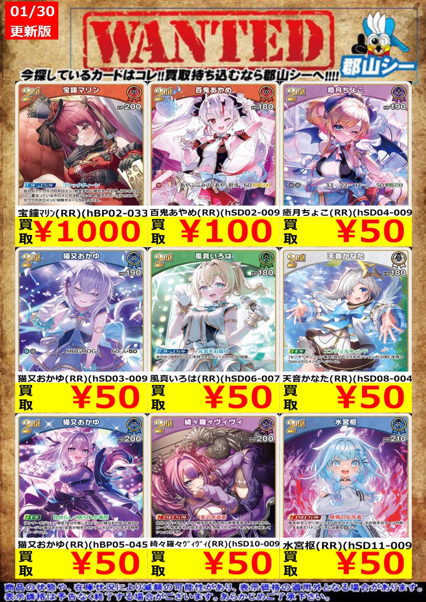 シーガル郡山店ホロライブOCGお買取り情報!! ※商品の状態や在庫状況により減額の可能性があり、表示価格の適用外となる場合がございます。 轟はじめ(R)(hSD05-008) ¥50 森カリオペ(RR)(hBP06-060) ¥50 宝鐘マリン(RR)(hBP02-033) ¥1,000