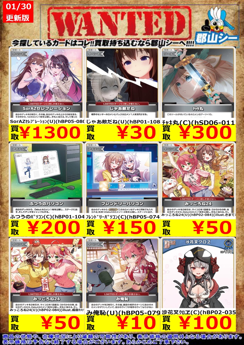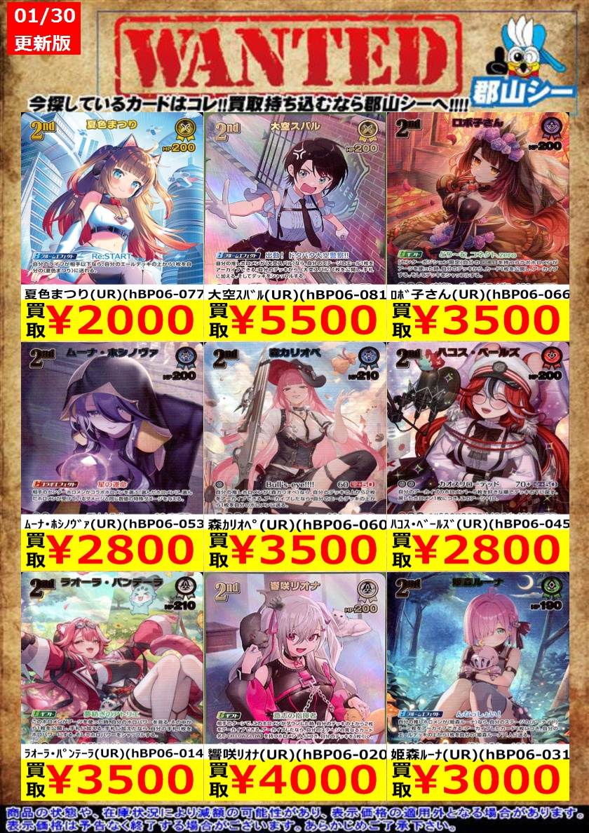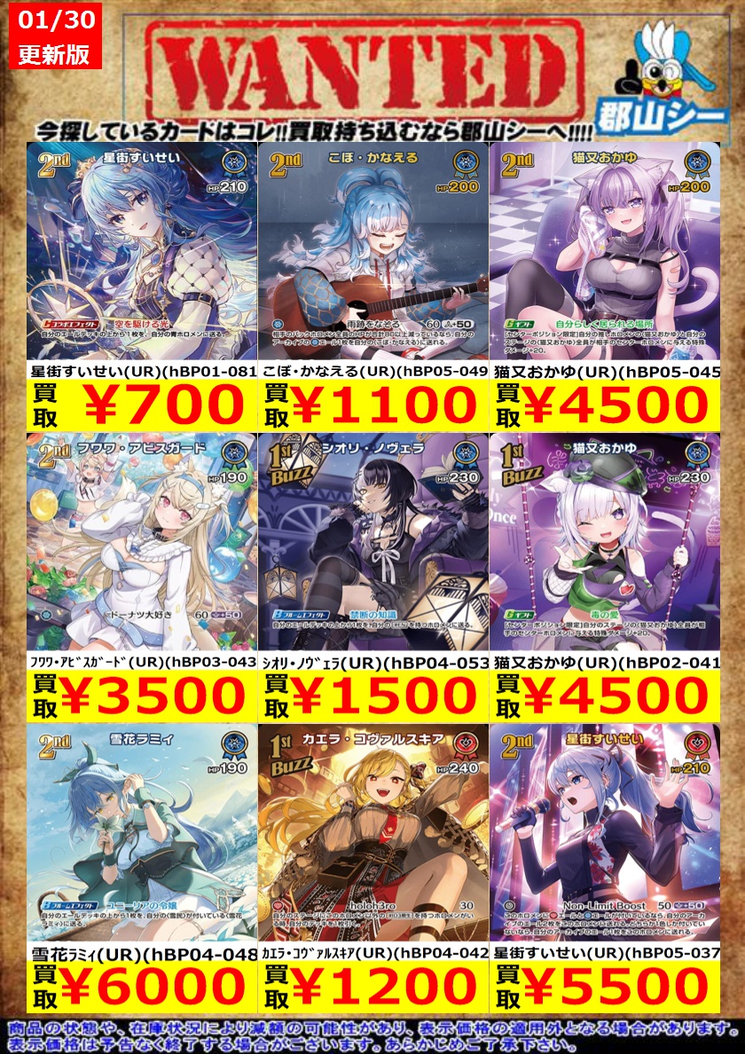 シーガル郡山店ホロライブOCGお買取り情報!! ※商品の状態や在庫状況により減額の可能性があり、表示価格の適用外となる場合がございます。 轟はじめ(UR)(hBP03-015) ¥2,500 白銀ノエル(UR)(hBP02-017) ¥3,000 風真いろは(UR)(hBP03-024) ¥4,000