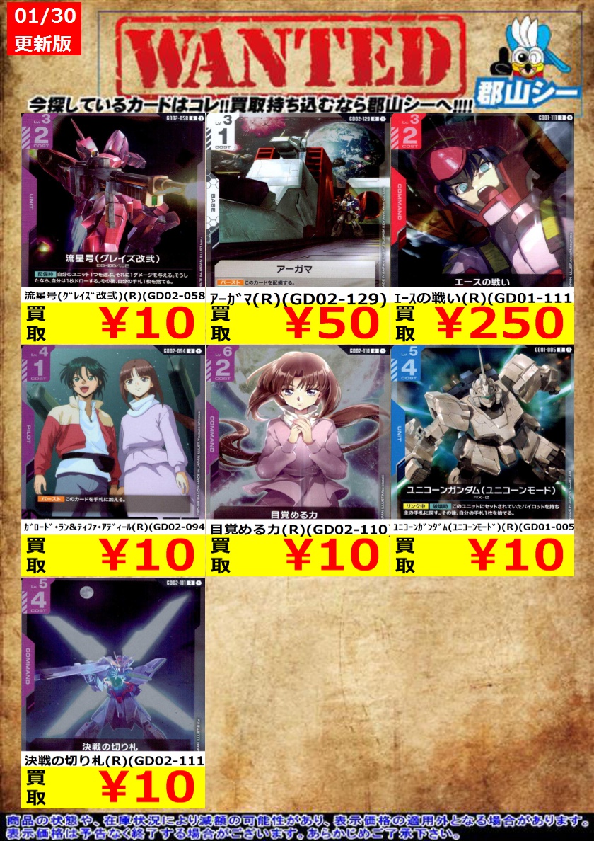 シーガル郡山店ガンダムCGお買取情報!! アーガマ(R)(GD02-129) ¥50 エースの戦い(R)(GD01-111) ¥250 目覚める力(R)(GD02-110) ¥10